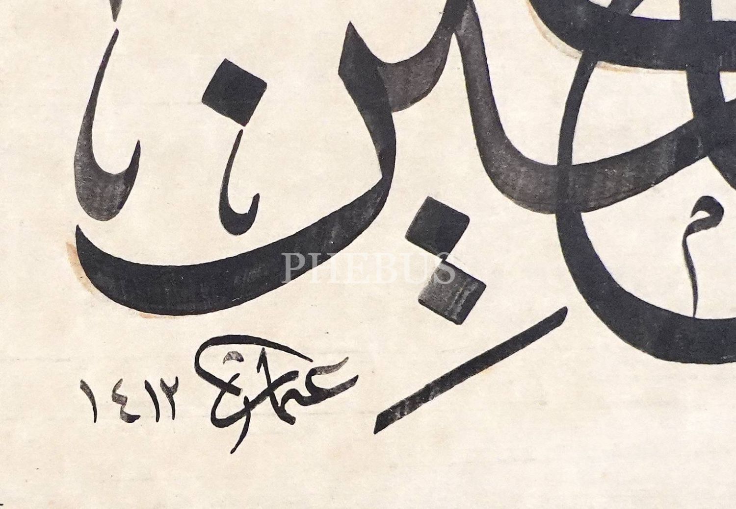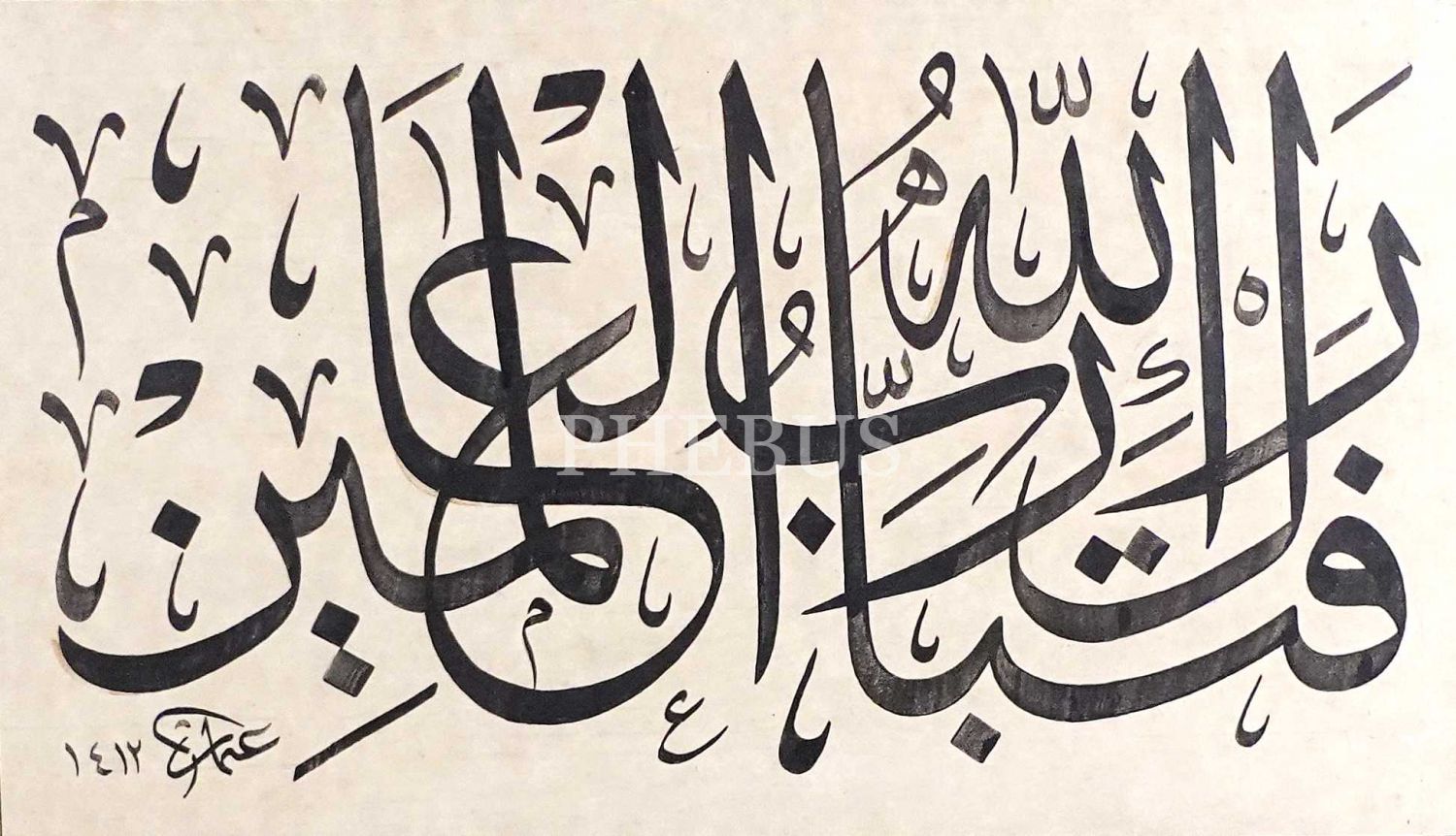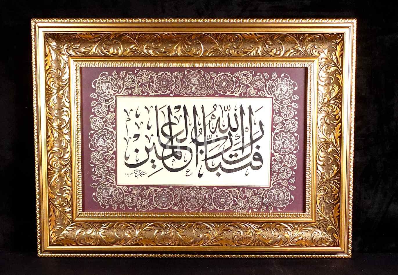 Celî sülüs ayet: "Âlemlerin rabbi Allah ne yücedir." (A´râf/54), Osman [Rebii Önol] ketebeli, 1412, tezhip: Safiye Ocaklı, çerçeve: 48x65 cm