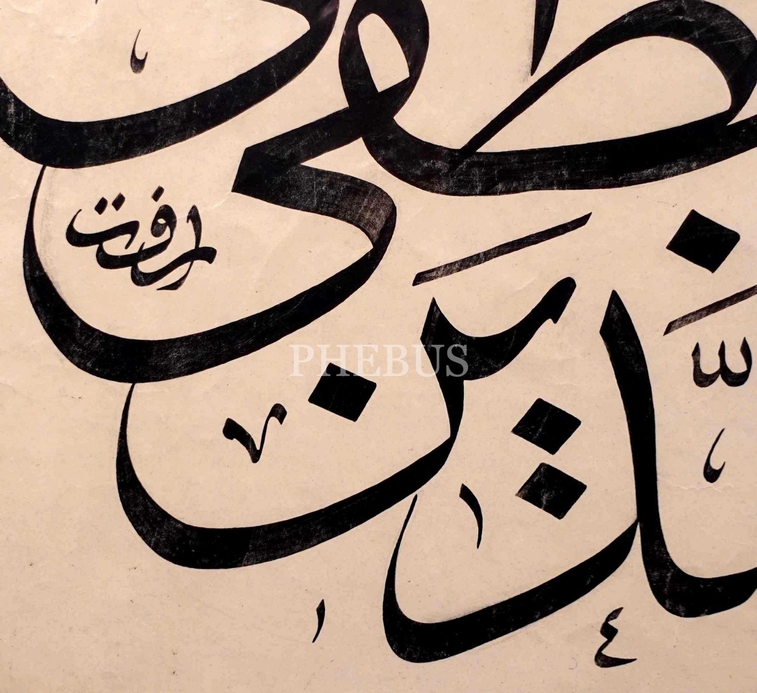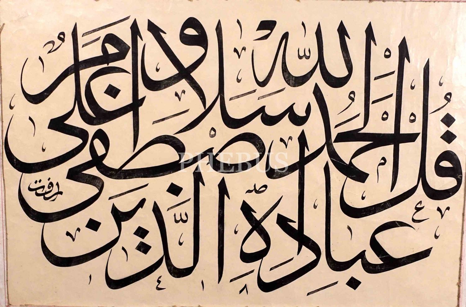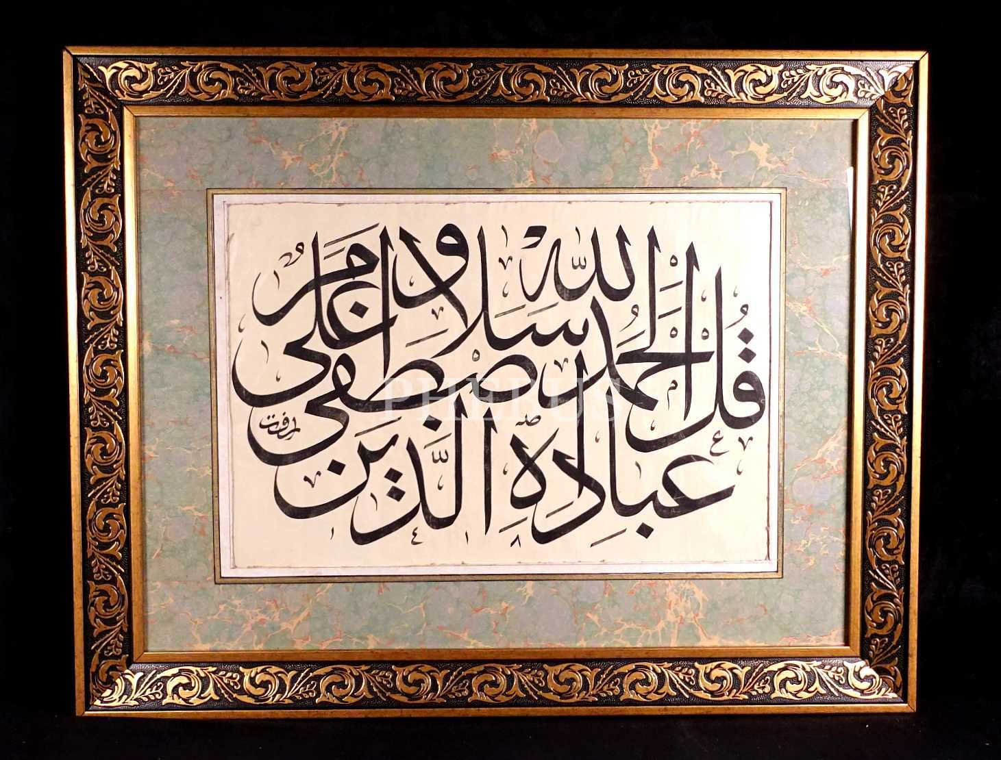 Celî sülüs ayet: "Hamd Allah´a, selam O´nun seçtiği kullar üzerine olsun" (Neml/59), Rafet [Küllüoğlu] ketebeli, 1418, ebru: Rafet Küllüoğlu, çerçeve: 57x73 cm