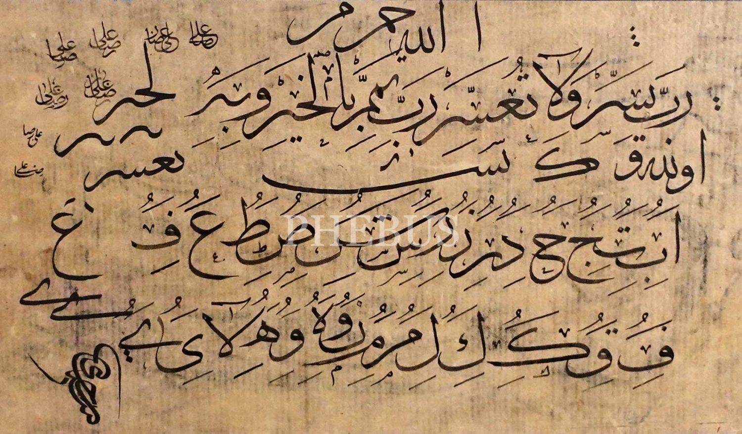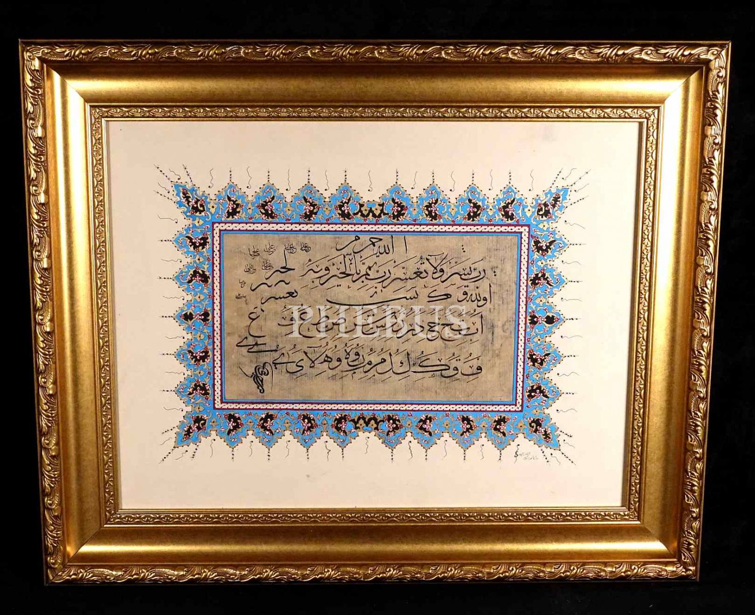Sülüs Rabbi Yessir ve hurufat meşki, [Hüseyin] Hüsnü ketebeli, tezhip: Safiye Ocaklı, çerçeve: 47x59 cm