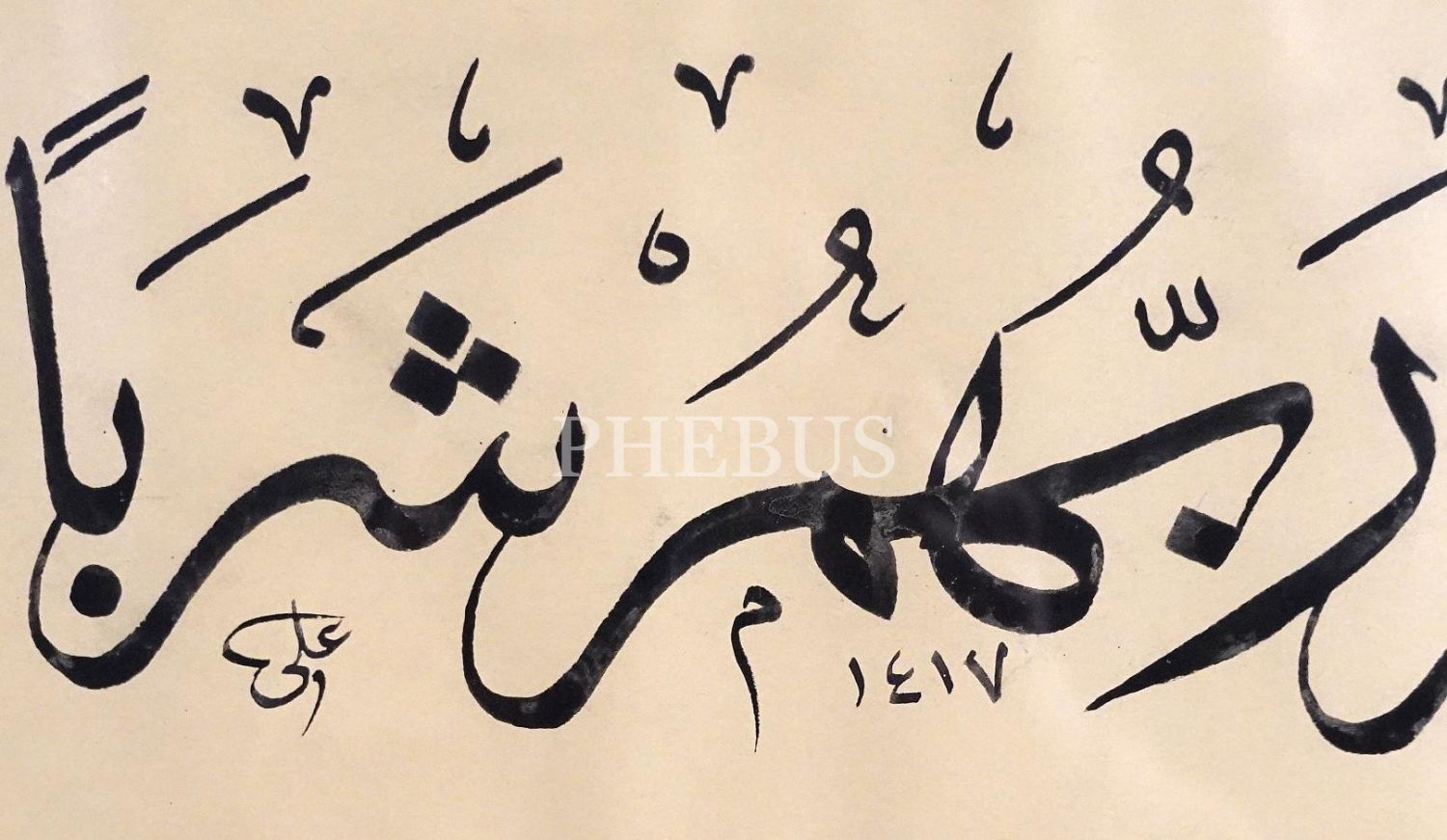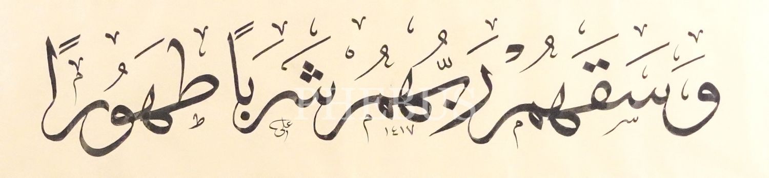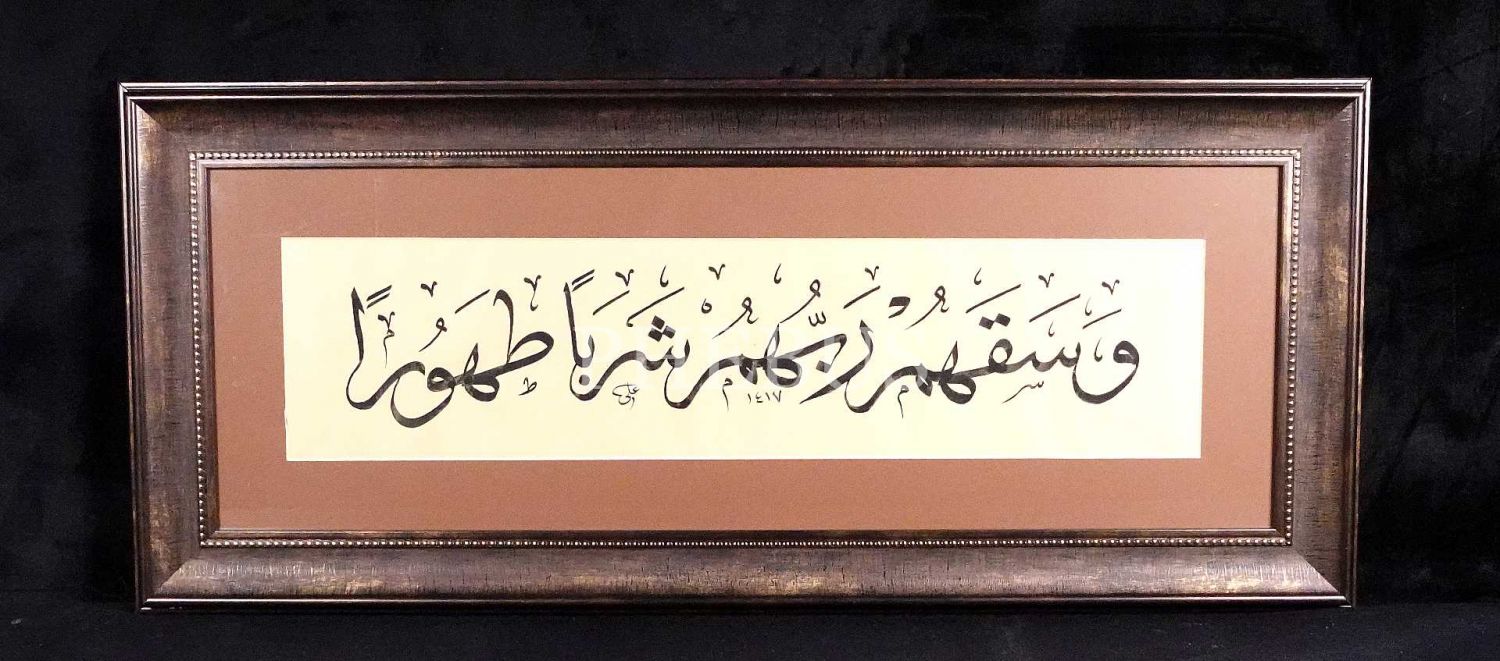 Celî sülüs ayet: "Rableri onlara tertemiz bir içki içirir" (İnsan/21), Ali [Selçuk Erkurt] ketebeli, 1417, çerçeve: 32x73 cm