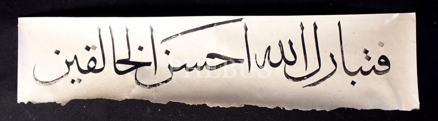 Celî sülüs ayet: "Yaratıcıların en güzeli olan Allah´ın şanı pek yücedir" (Mü´minûn/14), 12x55 cm