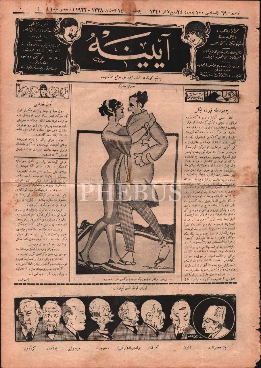 Milli mizah gazetesi AYİNE´nin "Lozan Konferansı tiplerinden" başlıklı kapak görseliyle 69. sayısı, 14 Kanunuevvel 1922, 28x39 cm