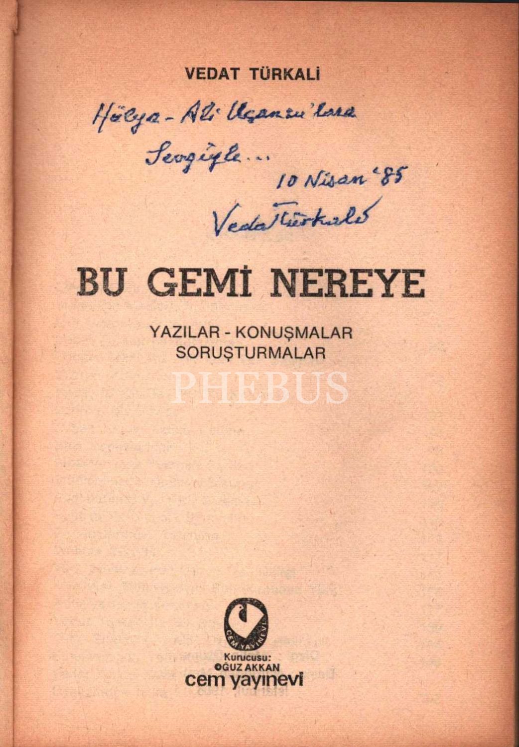 Vedat Türkali´den ithaflı ve imzalı BU GEMİ NEREYE (Yazılar - Konuşmalar - Soruşturmalar), Cem Yayınevi, İstanbul - 1985, 222 sayfa, 13x20 cm