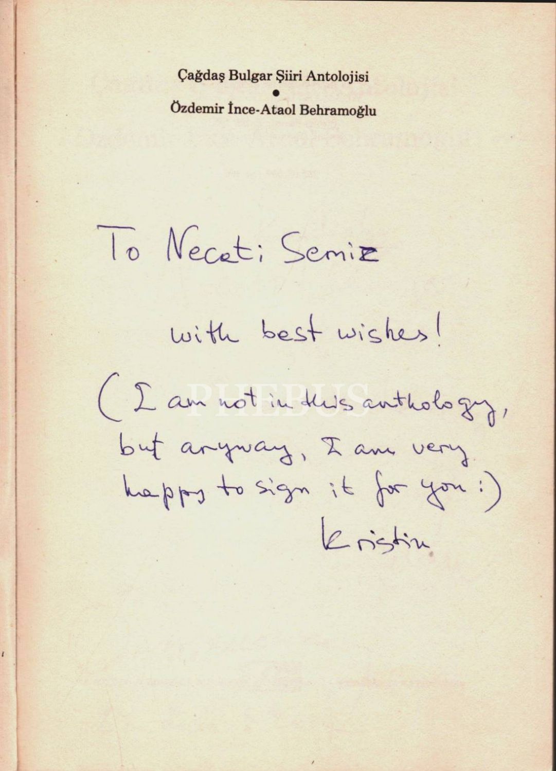 Özdemir İnce ve Ataol Behramoğlu´dan ithaflı ve imzalı ÇAĞDAŞ BULGAR ŞİİRİ ANTOLOJİSİ, Adam Yayınları, Şubat 1983, 163 sayfa, 14x20 cm