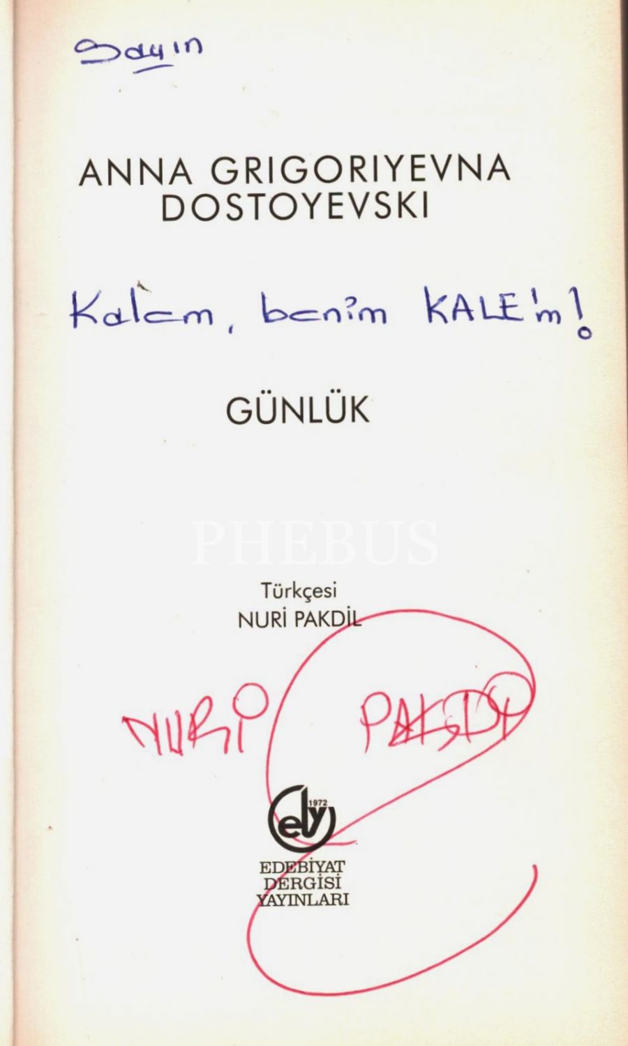Çevirmeni Nuri Pakdil´den imzalı GÜNLÜK, Anna Grigoriyevna Dostoyevski, Edebiyat Dergisi Yayınları, Mayıs 2014, 251 sayfa, 13x21 cm