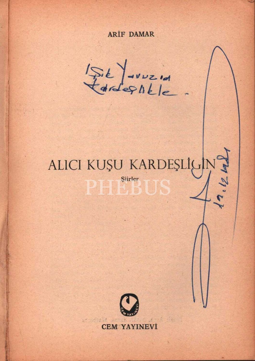 Arif Damar´dan ithaflı ve imzalı ALICI KUŞU KARDEŞLİĞİN, Cem Yayınevi, İstanbul - 1976, 133 sayfa, 14x20 cm
