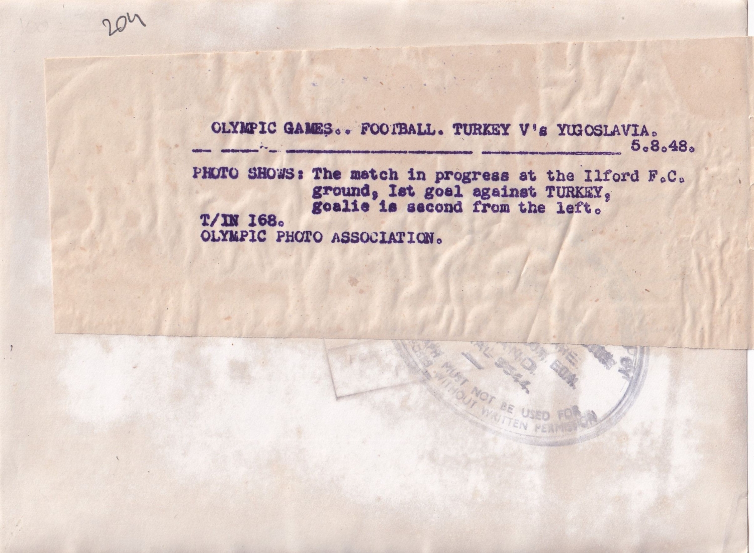 5 Ağustos 1948 Londra Olimpiyatları futbol çeyrek final mücadelesi, Türkiye Yugoslavya maçı, 20x15 cm