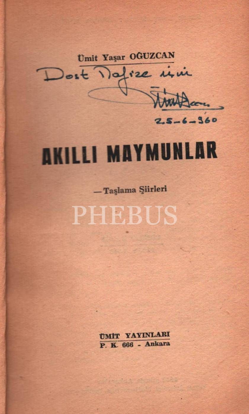 Ümit Yaşar Oğuzcan´dan ithaflı ve imzalı AKILLI MAYMUNLAR (Taşlama Şiirleri), Ümit Yayınları, Ankara - 1960, 103 sayfa, 12x19 cm