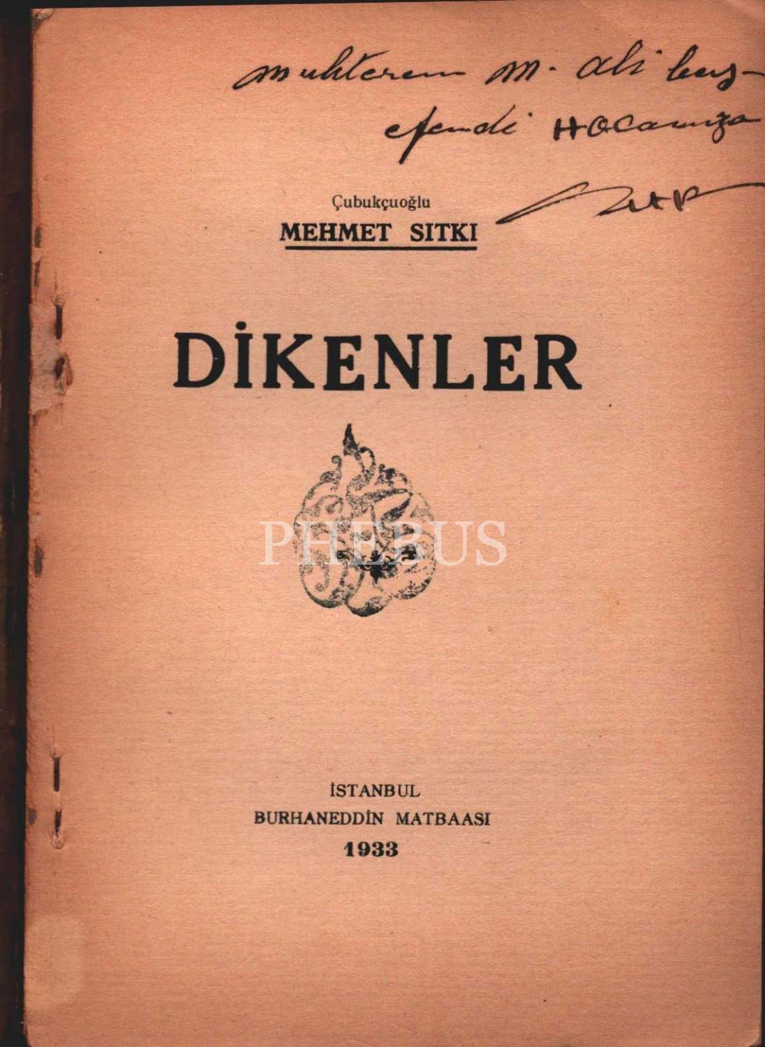 Mehmet Sıtkı Çubukçuoğlu´ndan Mehmed Ali [Ayni]´ye ithaflı ve imzalı DİKENLER, Burhaneddin Matbaası, İstanbul - 1933, 39 sayfa, 14x20 cm
