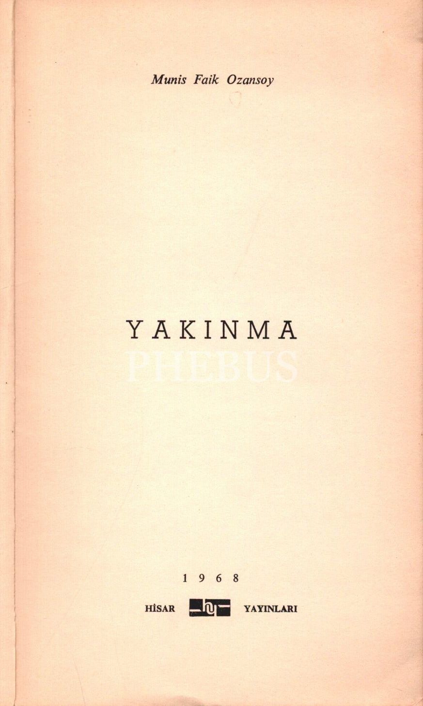 Munis Faik Ozansoy´dan Hüsamettin Atabeyli´ye ithaflı ve imzalı YAKINMA, Hisar Yayınları, Ankara - 1968, 38 sayfa, 11x19 cm