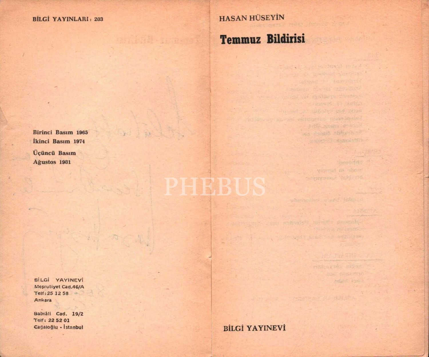 Hasan Hüseyin´den ithaflı ve imzalı TEMMUZ BİLDİRİSİ, Bilgi Yayınevi, 1981, 100 sayfa, 11x18 cm