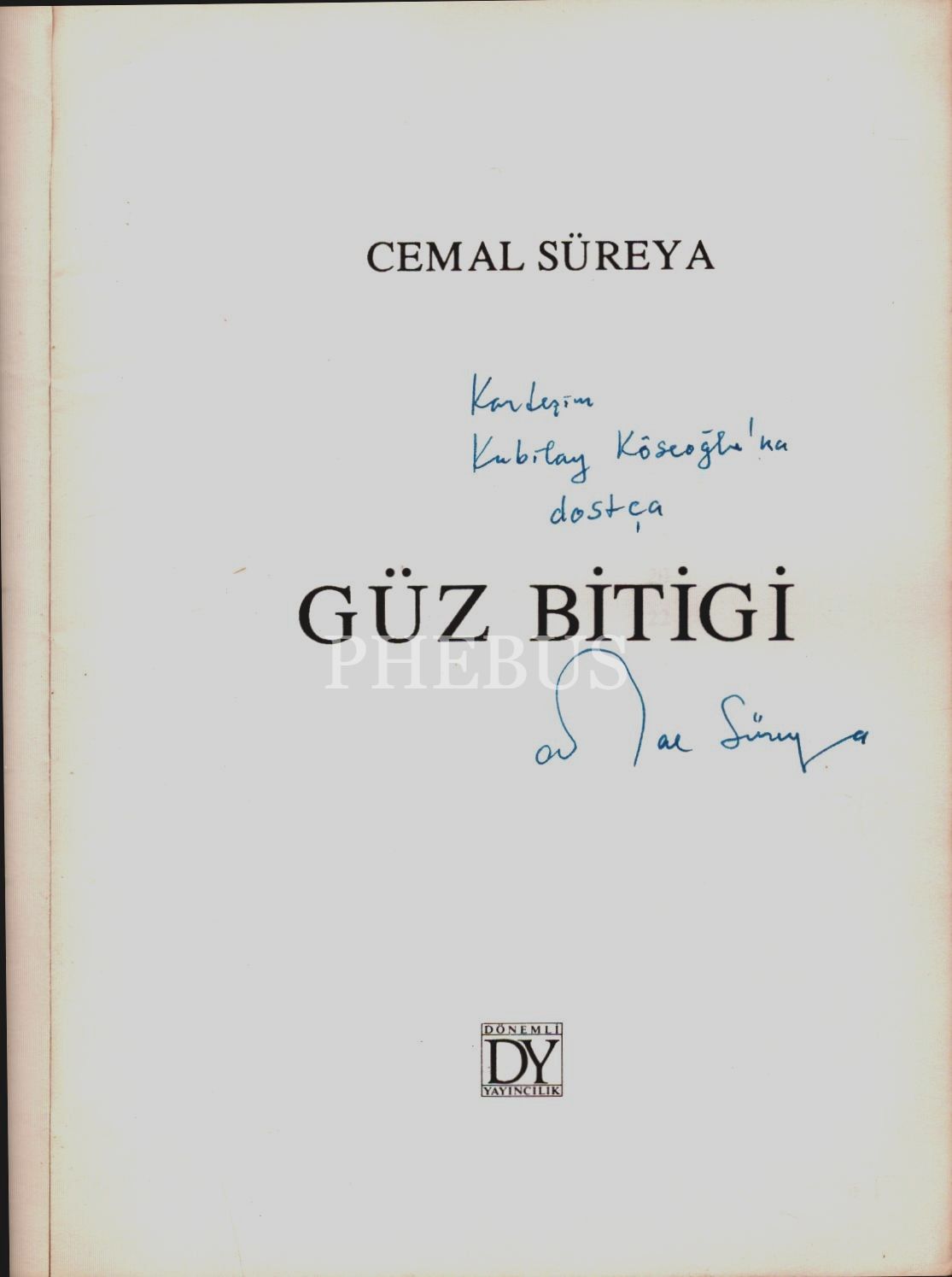 Cemal Süreya´dan Kubilay Köseoğlu'ya ithaflı ve imzalı GÜZ BİTİĞİ, Dönemli Yayıncılık, Nisan 1988, 68 sayfa, 14x20 cm