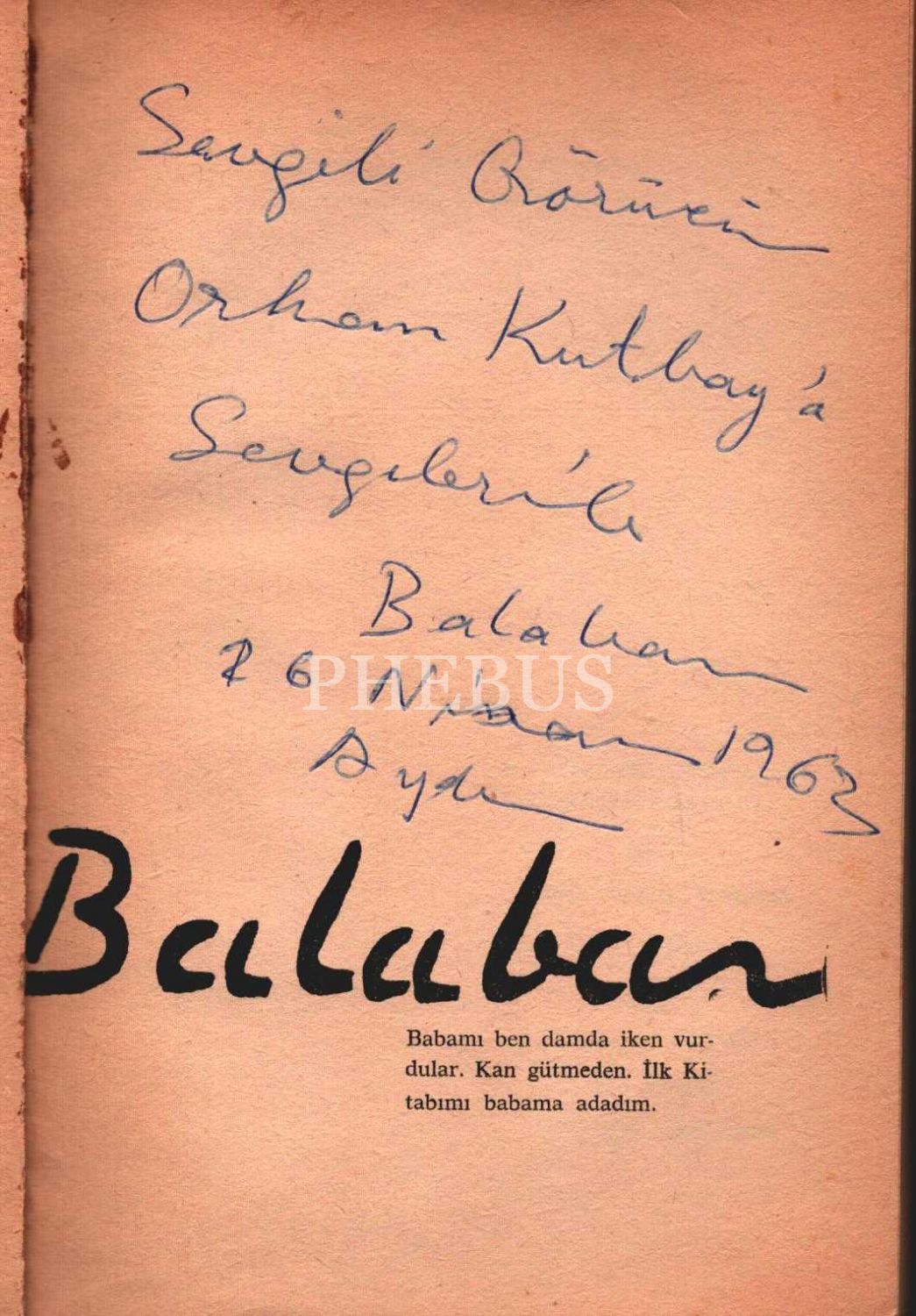 İthaf, "Sevgili ? Orhan Kutbay´a sevgilerle. Balaban 26 Nisan 1963 Aydın" şeklindedir.