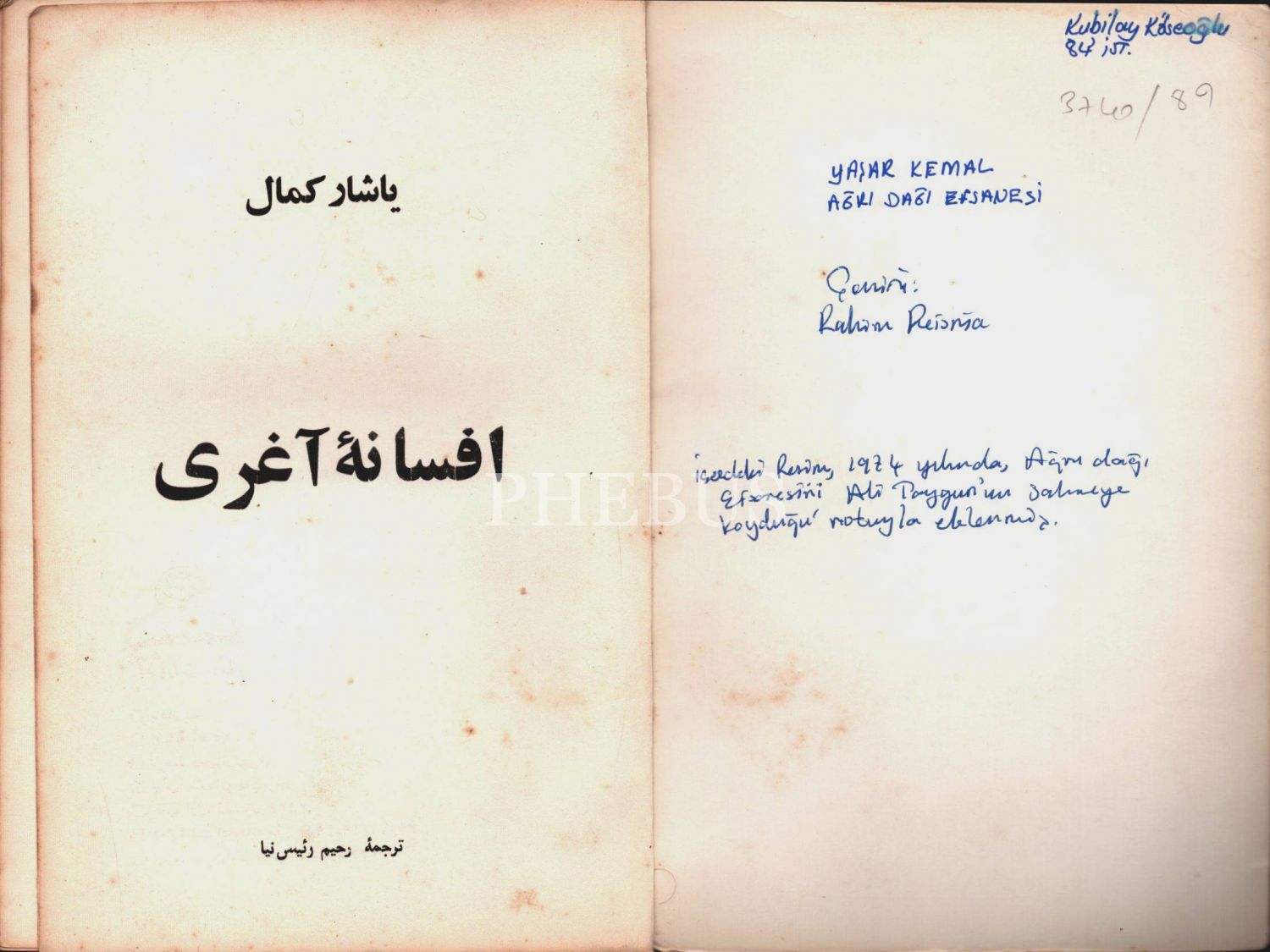 Farsça EFSÂNE-İ AĞRI/AĞRI DAĞI EFSANESİ, Yaşar Kemal, Farsçaya çev. Rahim Reis Niya, İntişarat-ı Dünya, Tahran, 195 sayfa, 14x22 cm