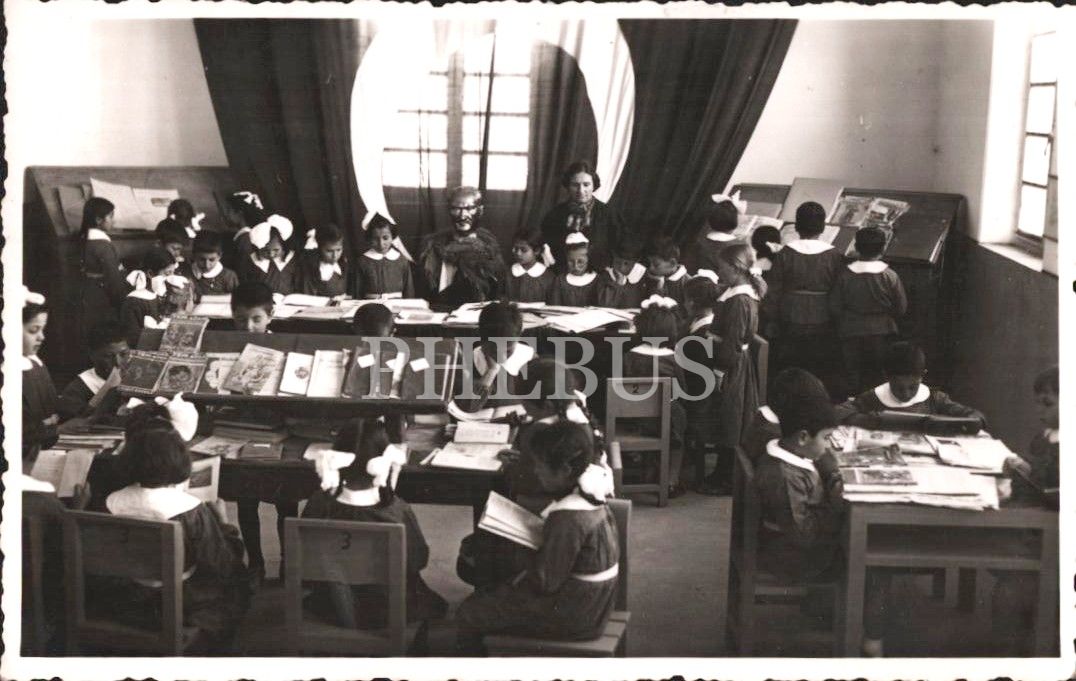 Çankaya Okulu´nun, Atatürk büstü etrafında dergi ve kitapları inceleyen önlüklü talebeleri, 2 Mart 1939, 9x14 cm