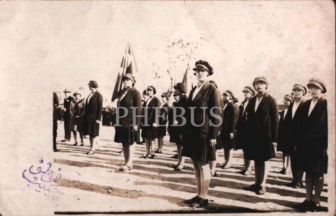 Tören esnasında ay yıldızlı bayrak ile kız öğrenciler, Foto Habib damgalı, 9x14 cm