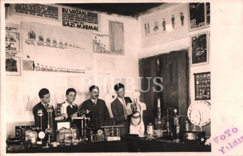 Adapazarı Ortamektep öğrencilerinin laboratuvarda öğretmenleri ile çektirdiği hatıra fotoğrafı, 29 Teşrinievvel 1933, 9x14 cm