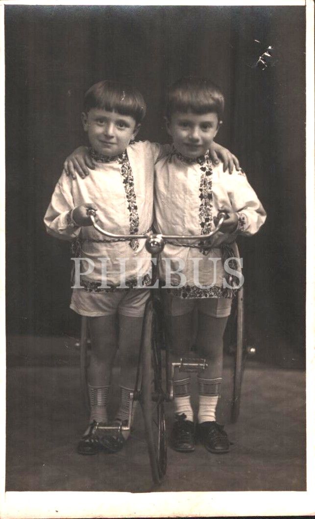 Üç tekerlekli bisikletle poz veren iki sevimli miniğin kardeşlik hatırası, 8x13 cm