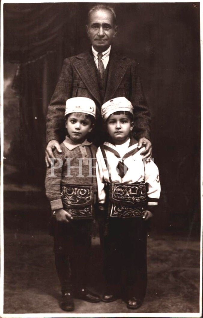 Ay yıldızlı takkeleri ve işlemeli cüz çantalarıyla poz veren iki erkek çocuk, 9x14 cm