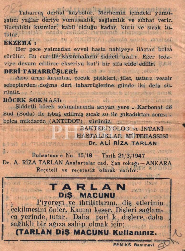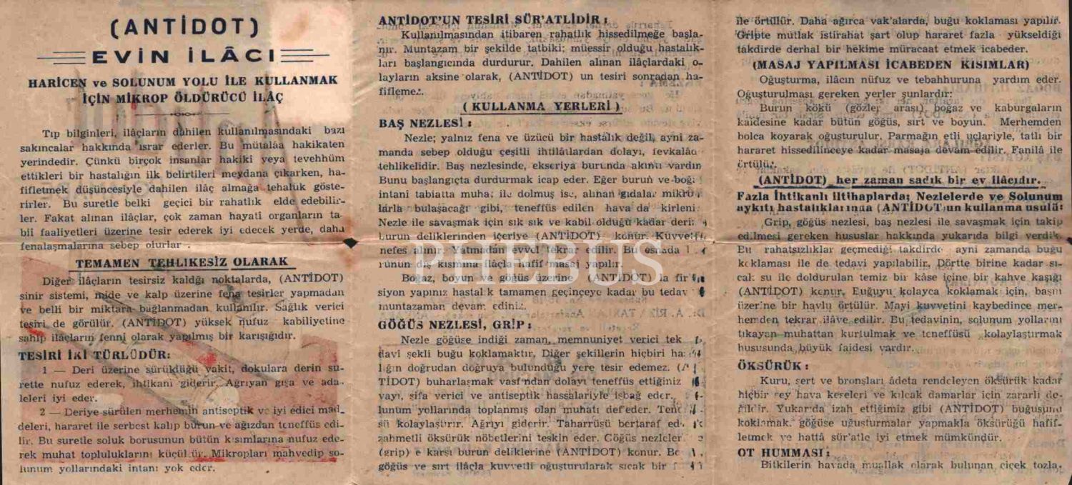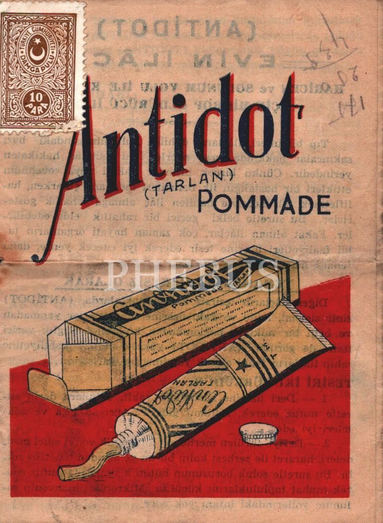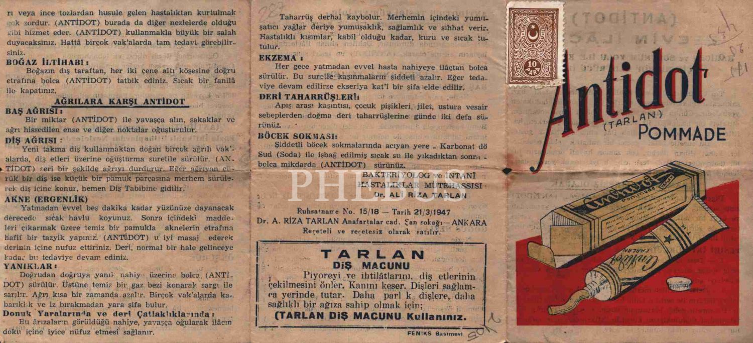 Antidot (Tarlan) Evin İlâcı reklam tanıtım broşürü, Türkiye Cumhuriyeti damga pullu, 10x13 cm