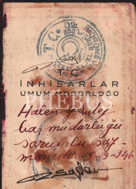 T.C. İnhisarlar İdaresi memurlarına mahsus fotoğraflı hüviyet cüzdanı, 1946, 7x11 cm