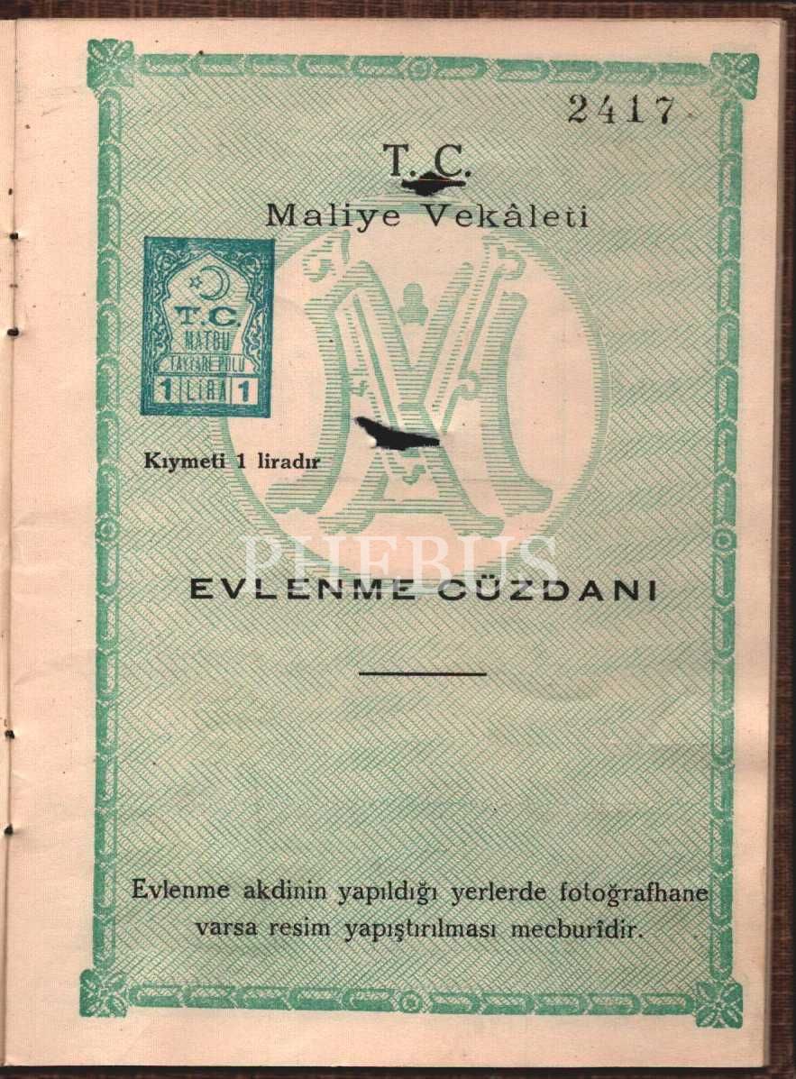 T.C. Maliye Vekâleti Evlenme Cüzdanı, Ankara 1938, 11x15 cm