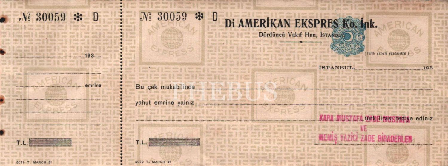 Kara Mustafa Zade ve Memiş Yazici Zade Biraderler damgalı, Di Amerikan Ekspress Ko. İnk. çeki, 9x24 cm