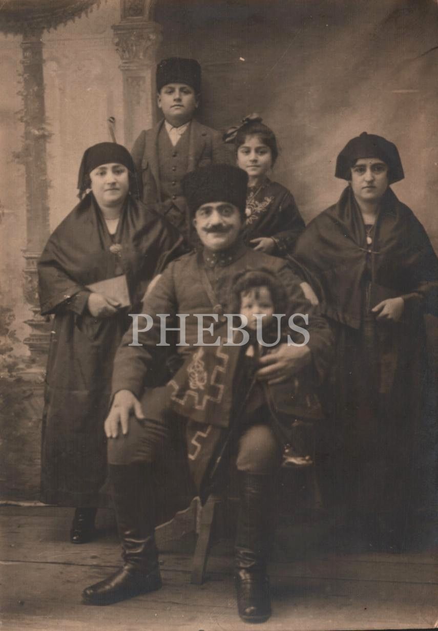 Osmanlı dönemi kalpaklı subay ve ailesinin stüdyo fotoğrafı, 11x16 cm