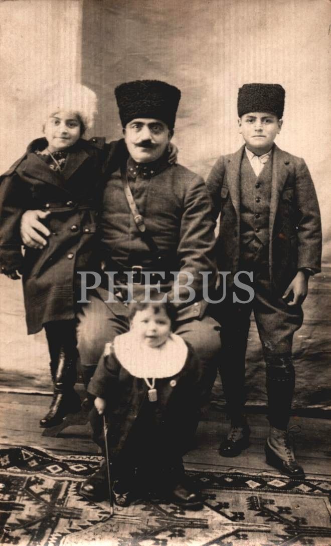 Osmanlı dönemi kalpaklı subay ve çocuklarının hatıra fotoğrafı, 9x14 cm