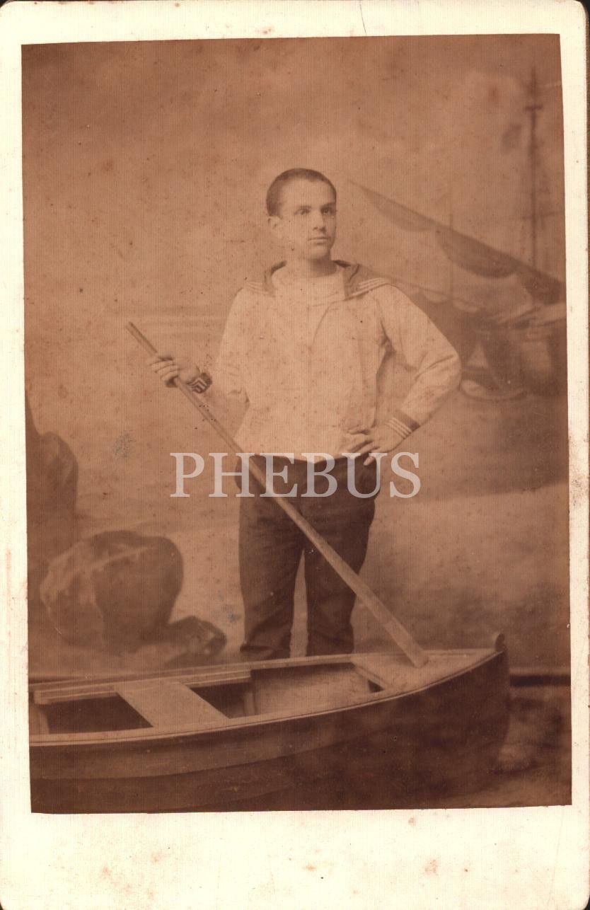 Kayık önünde denizci kıyafetleriyle poz veren beyefendinin stüdyo fotoğrafı, 10x16 cm