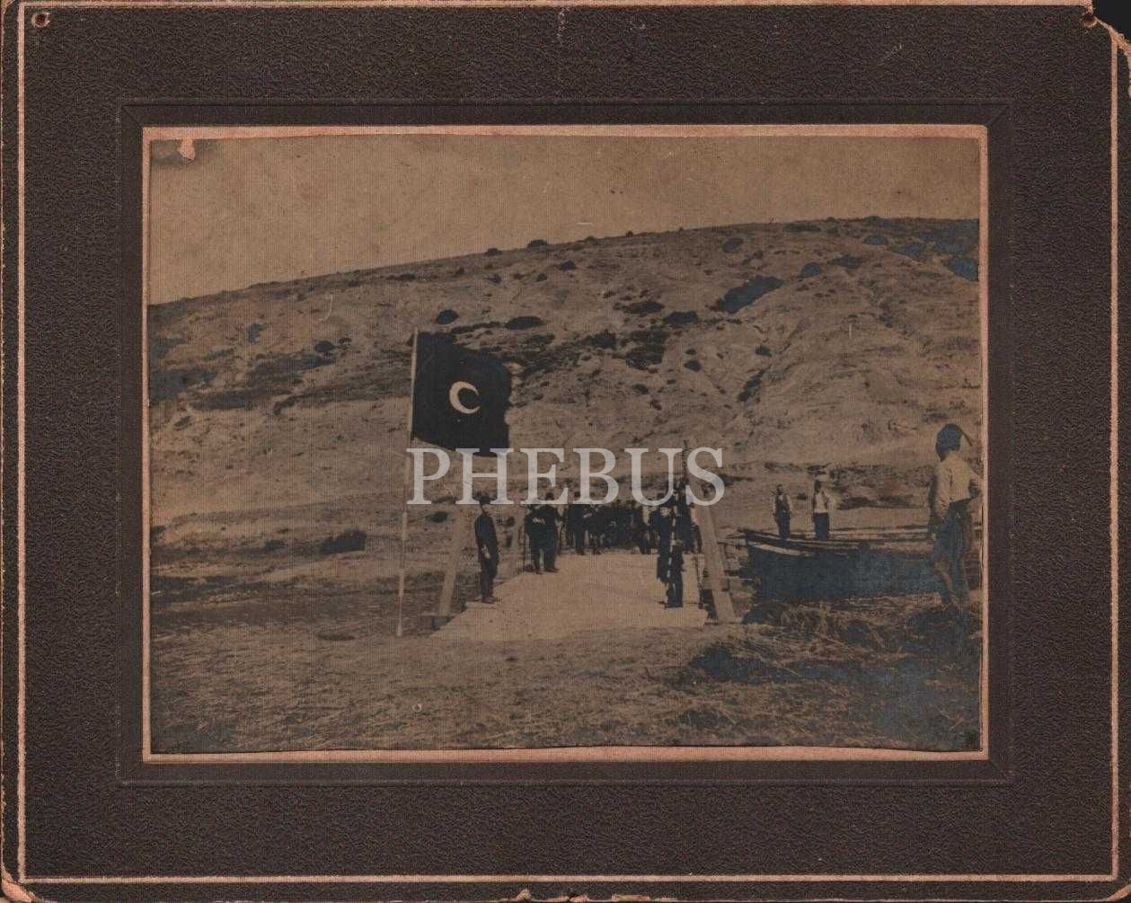 Hilal bayraklı asma köprü üzerinde üniformalı askerler, 13x16 cm