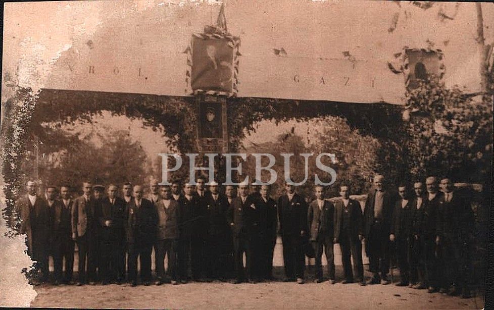 "Varol Gazi" yazısı ve Atatürk fotoğraflarının asılı olduğu tak ile Cumhuriyet Bayramı kutlamaları, 29 Ekim 1931, 9x14 cm