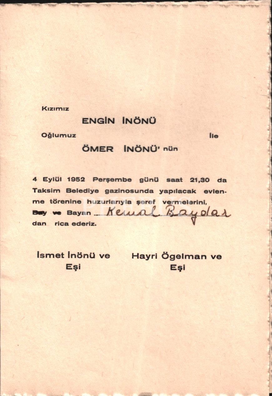 İsmet İnönü´nün büyük oğlu Ömer İnönü ile Engin Ögelman´ın düğün davetiyesi, 4 Eylül 1952, 11x16 cm
