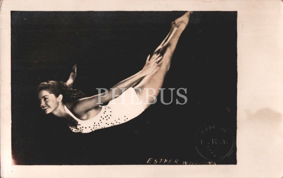 Amerikalı oyuncu ve profesyonel yüzücü Esther Williams´ın "Made by E. K. T." soğuk damgalı bir fotokartı, 14x9 cm
