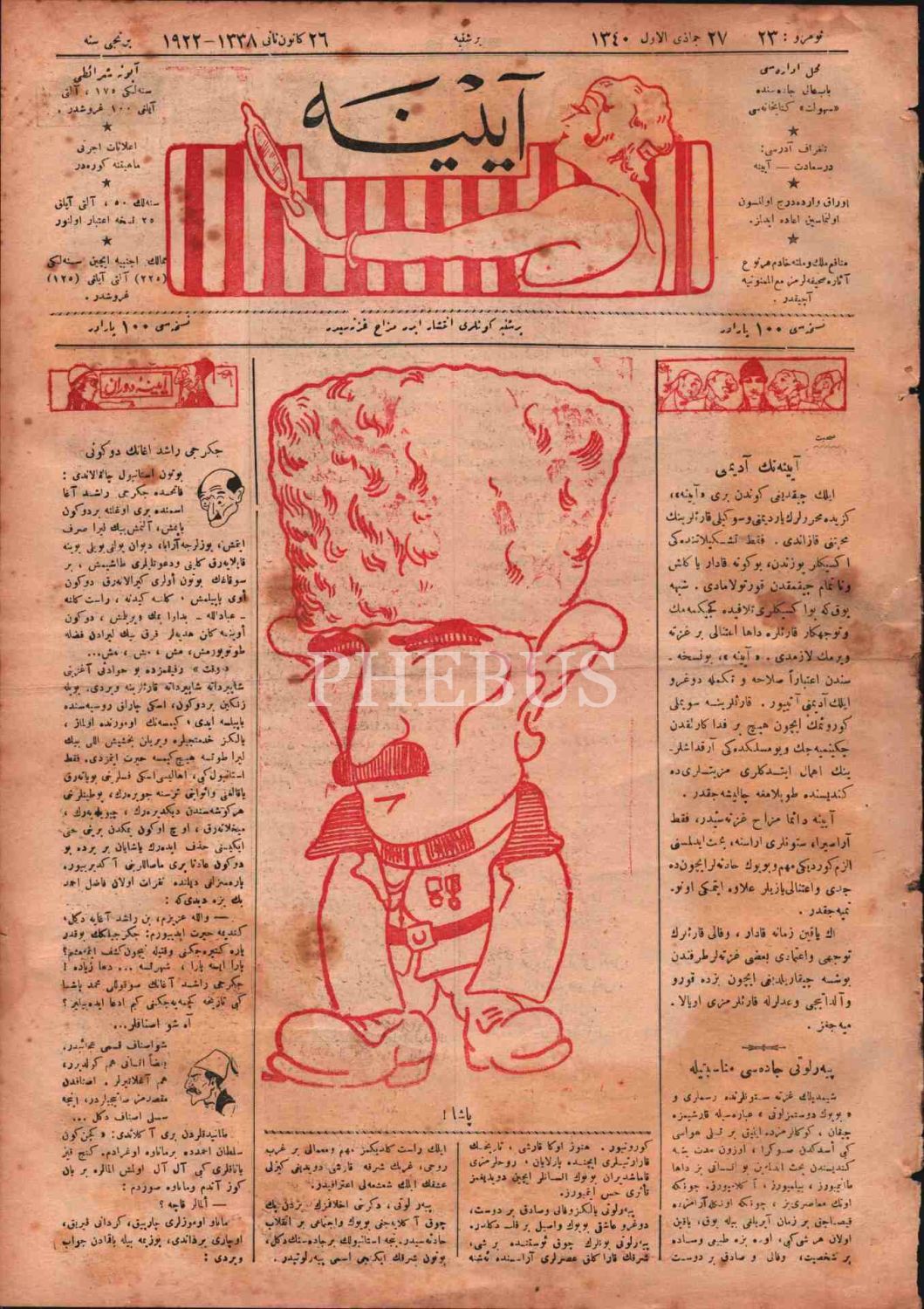 Mustafa Kemal Atatürk tasvirli kapak görseliyle haftalık mizah dergisi ÂYİNE´nin 23. sayısı, 26 Kanunusani 1922, 28x38 cm