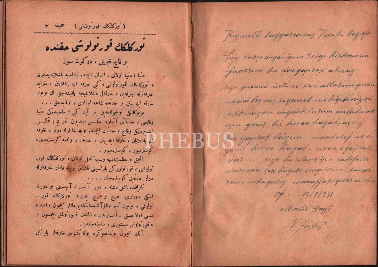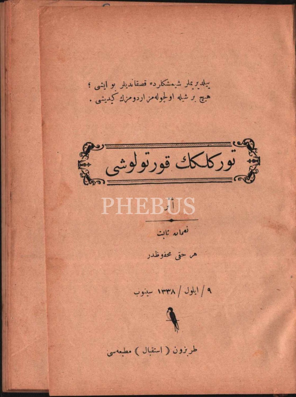 Yazarından kıymetli tayyarecimiz Vecihi Hürkuş'a ithaflı ve imzalı TÜRKLÜĞÜN KURTULUŞU, Numan Sabit, Trabzon İstikbal Matbaası, 13 Eylül 1931, 44 s., 14x20 cm
