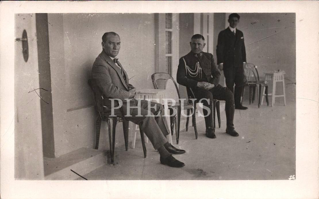 Marmara Köşkü balkonunda Mustafa Kemal Atatürk, başyaver Rüsuhi Bey ve arkada Bekir Çavuş, 6 Mayıs 1932, 9x14 cm