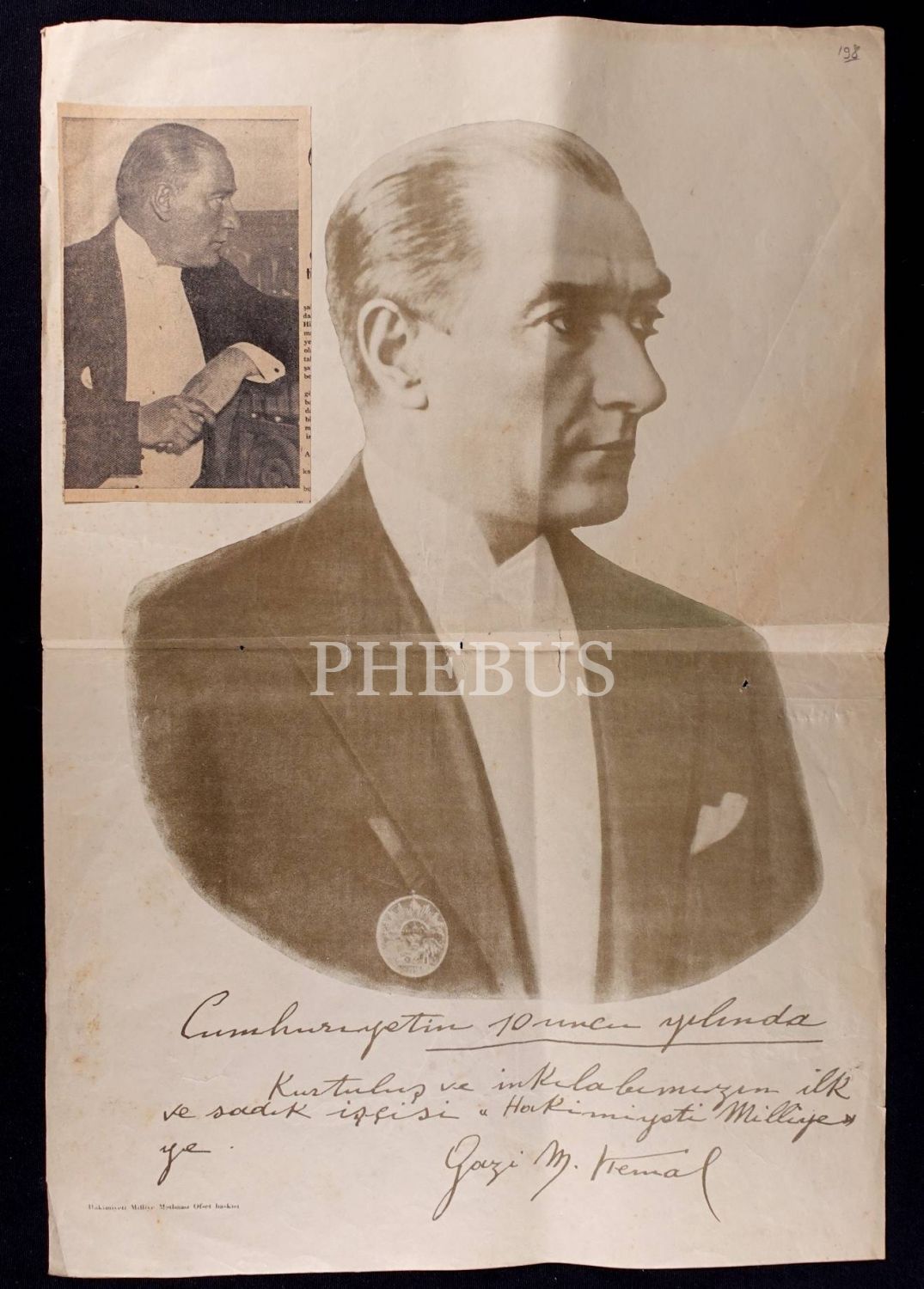 "Cumhuriyetin 10 uncu yılında Kurtuluş ve inkilabımızın ilk ve sadık işçisi "Hakimiyeti Milliye" ye. Gazi M. Kemal"
