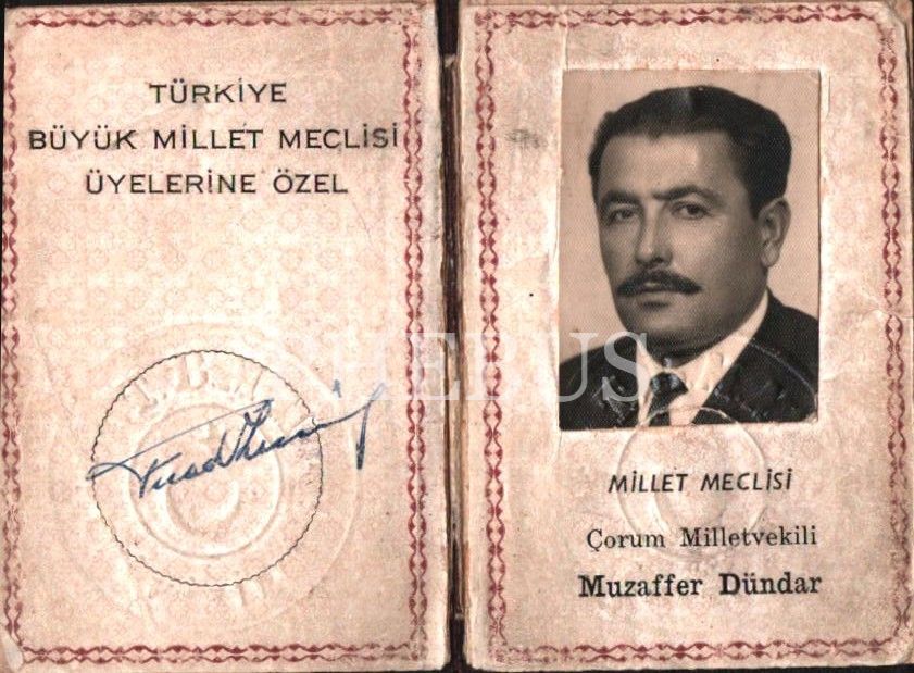 Çorum Milletvekili Muzaffer Dündar´a ait hüviyet varakası, 5x8 cm