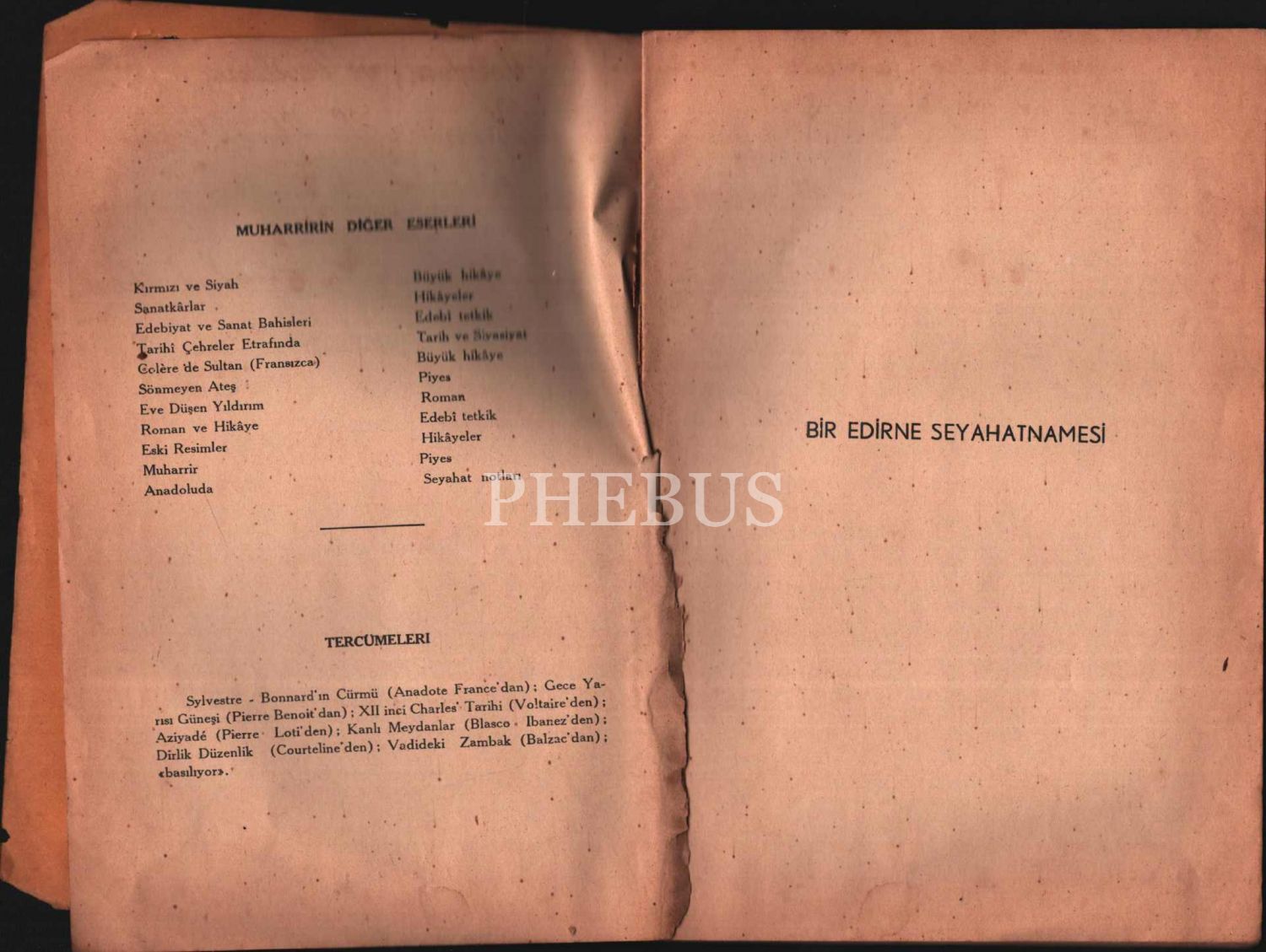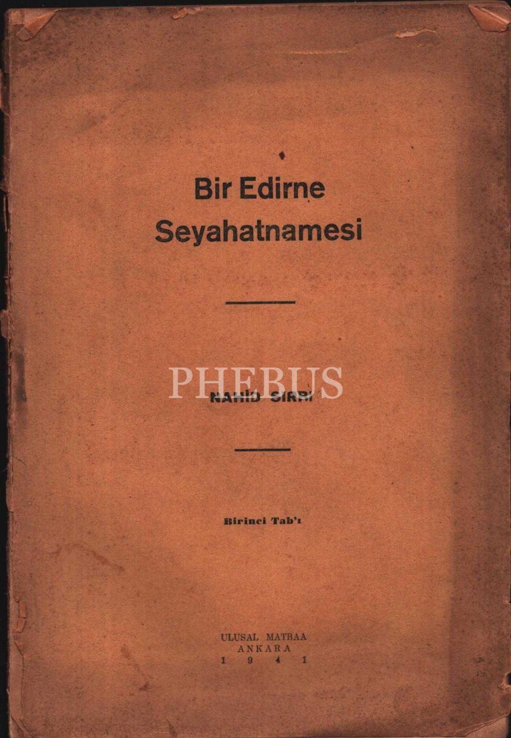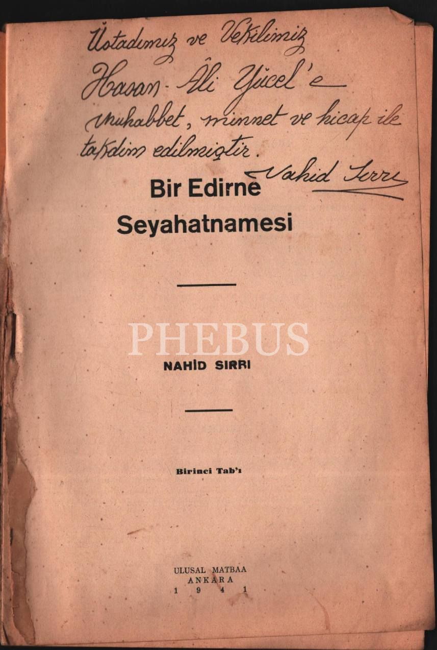 Nahid Sırrı tarafından Köy Enstitülerinin kurucusu Hasan Âli Yücel´e ithaflı ve imzalı BİR EDİRNE SEYAHATNAMESİ [1. baskı], Ulusal Matbaa, Ankara 1941, 61 s., 16x24 cm
