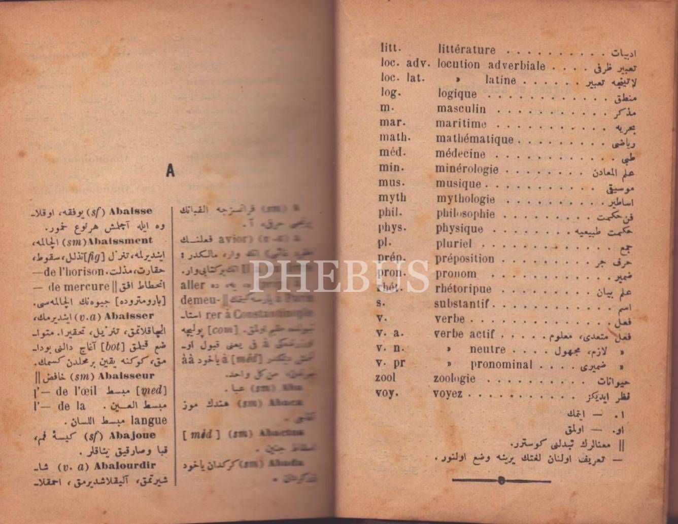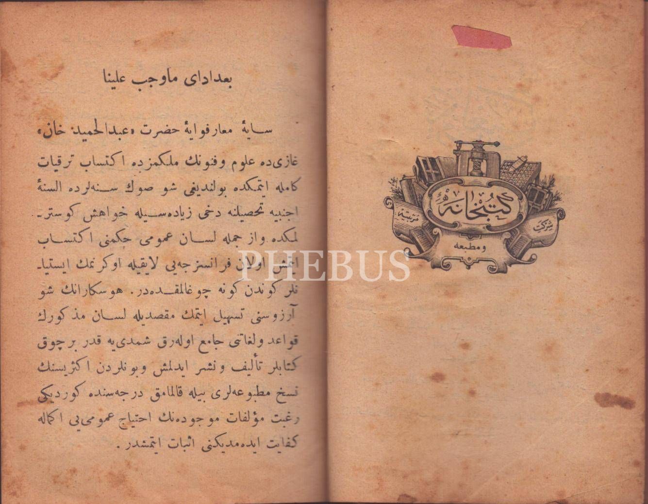 Osmanlı armalı ve ay yıldızlı cildinde FRANSIZCADAN TÜRKÇEYE YENİ LÜGAT (Nouveau Dictionnaire Français-Turc), Mehmed Fuad, Şirket-i Mürettibiye Matbaası, İstanbul 1310, 1336 s., 9x14 cm
