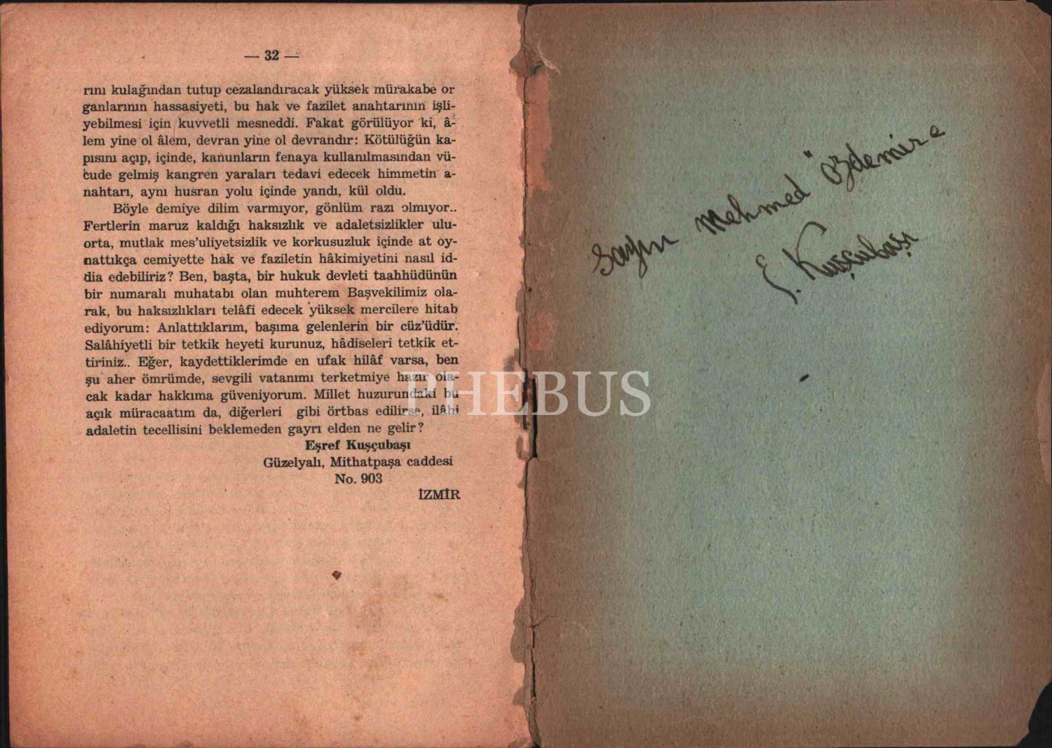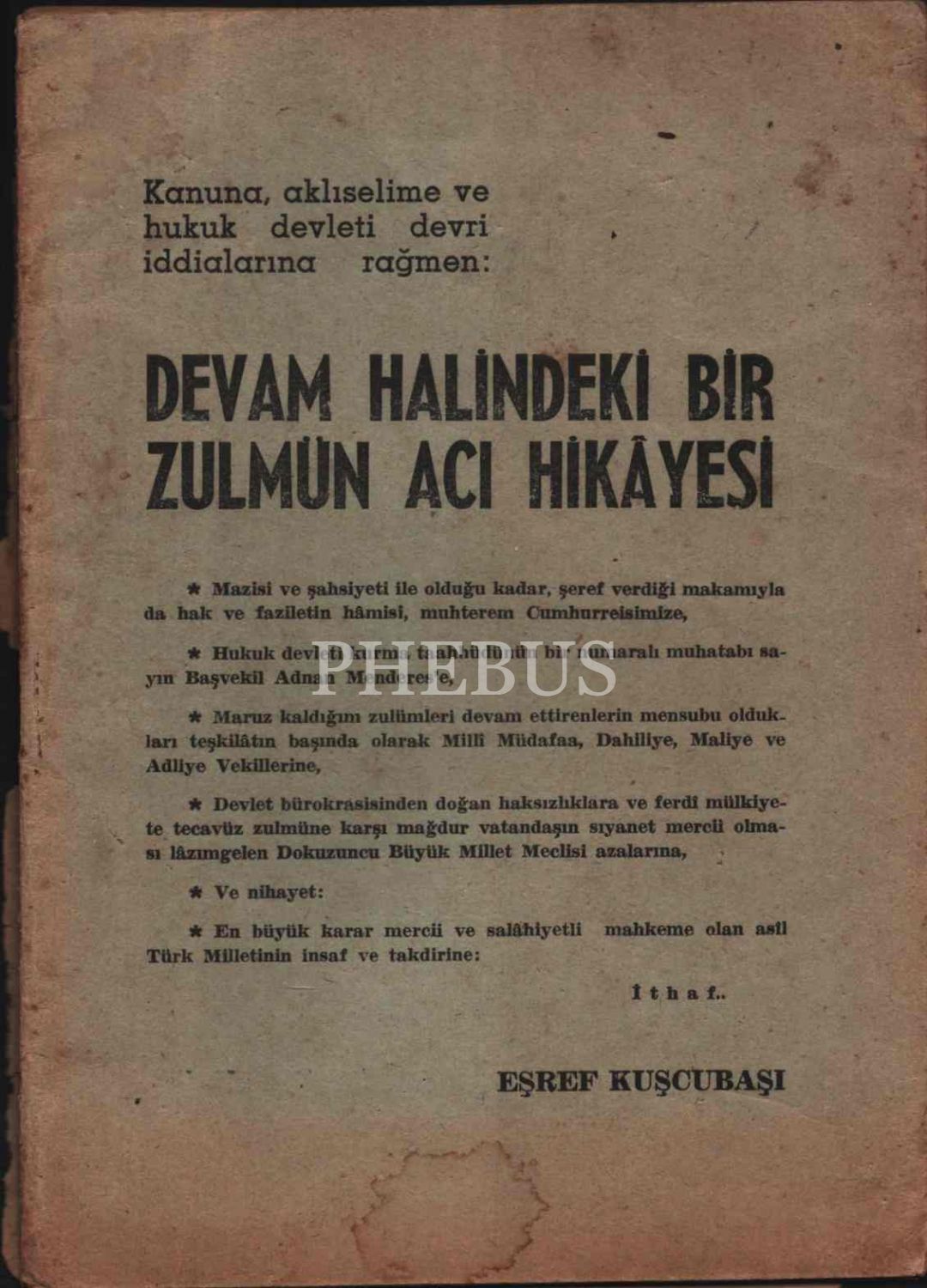 Teşkîlât-ı Mahsûsa’nın kurucusu Eşref Kuşcubaşı´dan ithaflı ve imzalı KANUNA, AKLISELİME VE HUKUK DEVLETİ DEVRİ İDDİALARINA RAĞMEN: DEVAM HALİNDEKİ BİR ZULMÜN ACI HİKÂYESİ