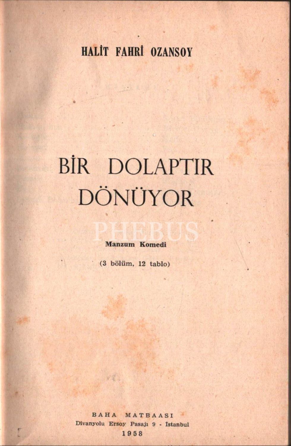 Halit Fahri Ozansoy´dan ithaflı ve imzalı BİR DOLAPTIR DÖNÜYOR, Baha Matbaası, İstanbul 1958, 155 s., 14x19 cm