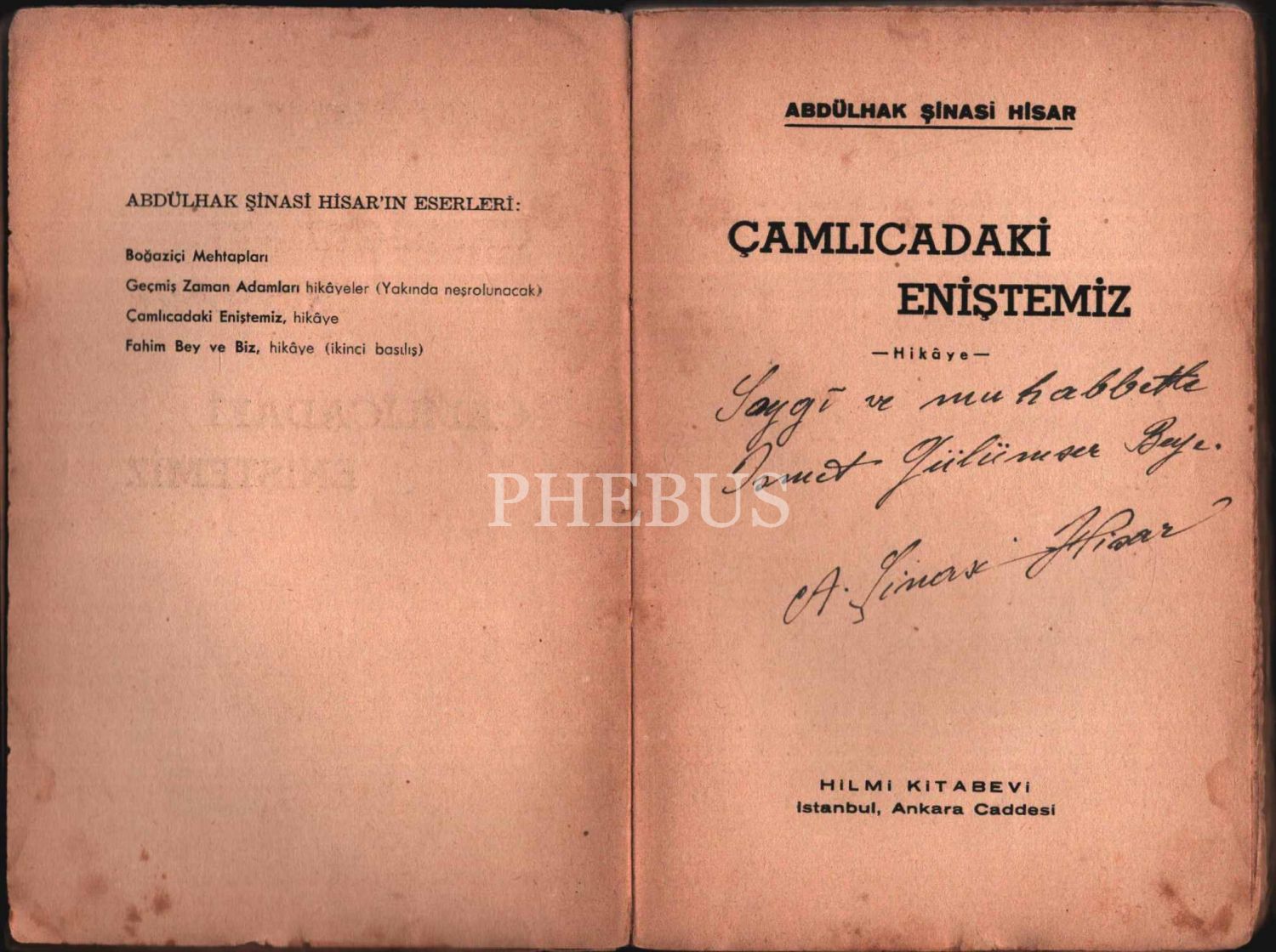 Abdülhak Şinasi Hisar´dan ithaflı ve imzalı ÇAMLICADAKİ ENİŞTEMİZ, Hilmi Kitabevi, 358 s., 13x19 cm