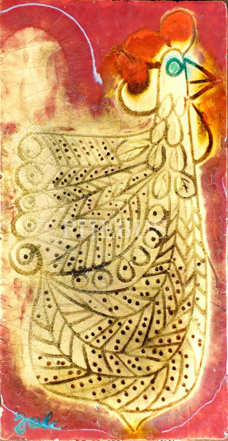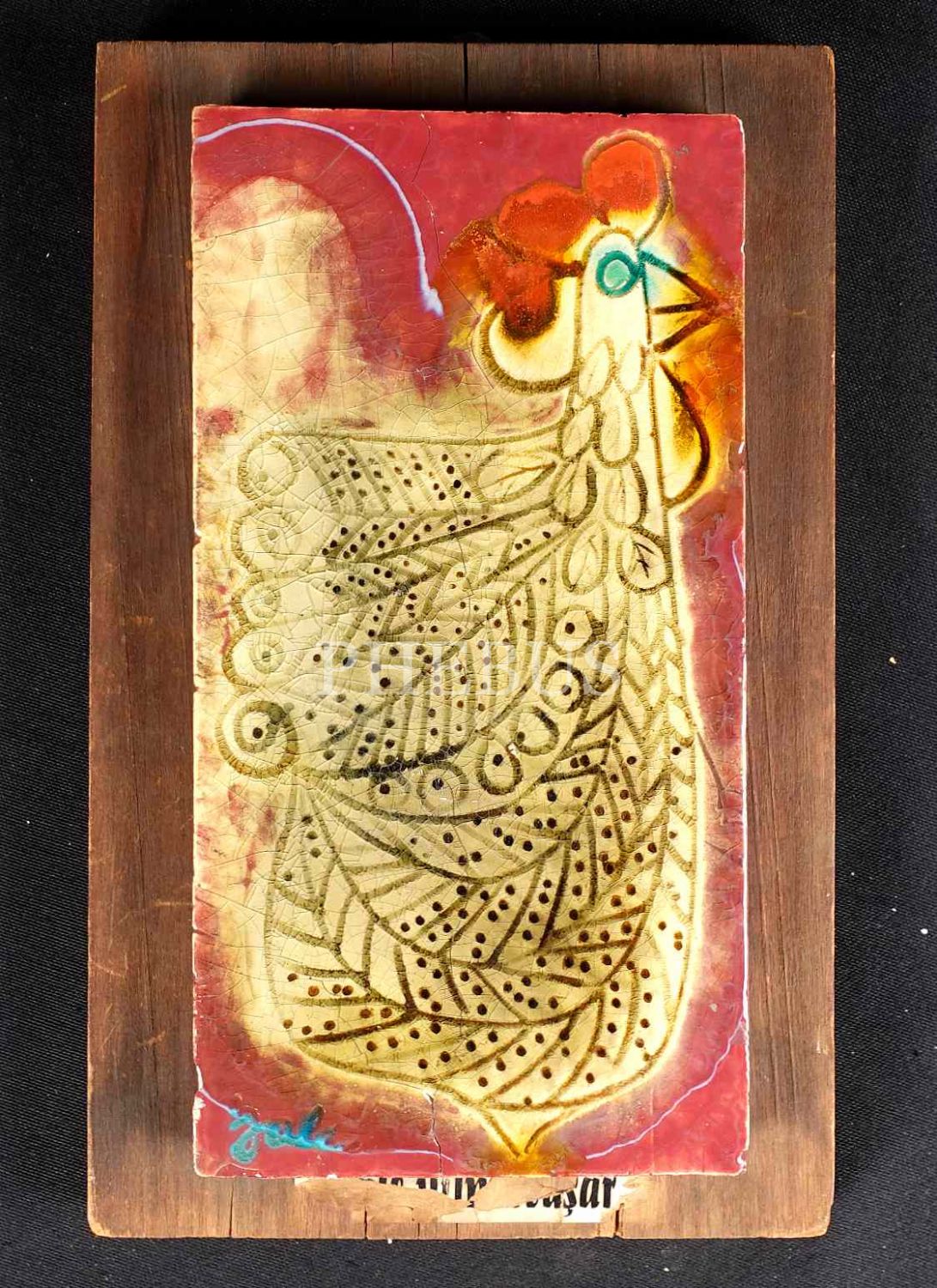 Ressam ve seramik sanatçısı Jale Yılmabaşar imzalı ahşap üzerine seramik boyama horoz çalışması, 19x29 cm