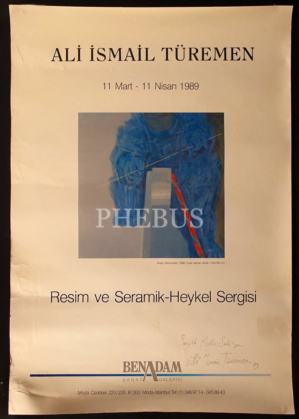 Ali İsmail Türemen tarafından imzalı "Resim ve Seramik-Heykel Sergisi" afişi, Benadam Sanat Galerisi, 1989, 48x70 cm