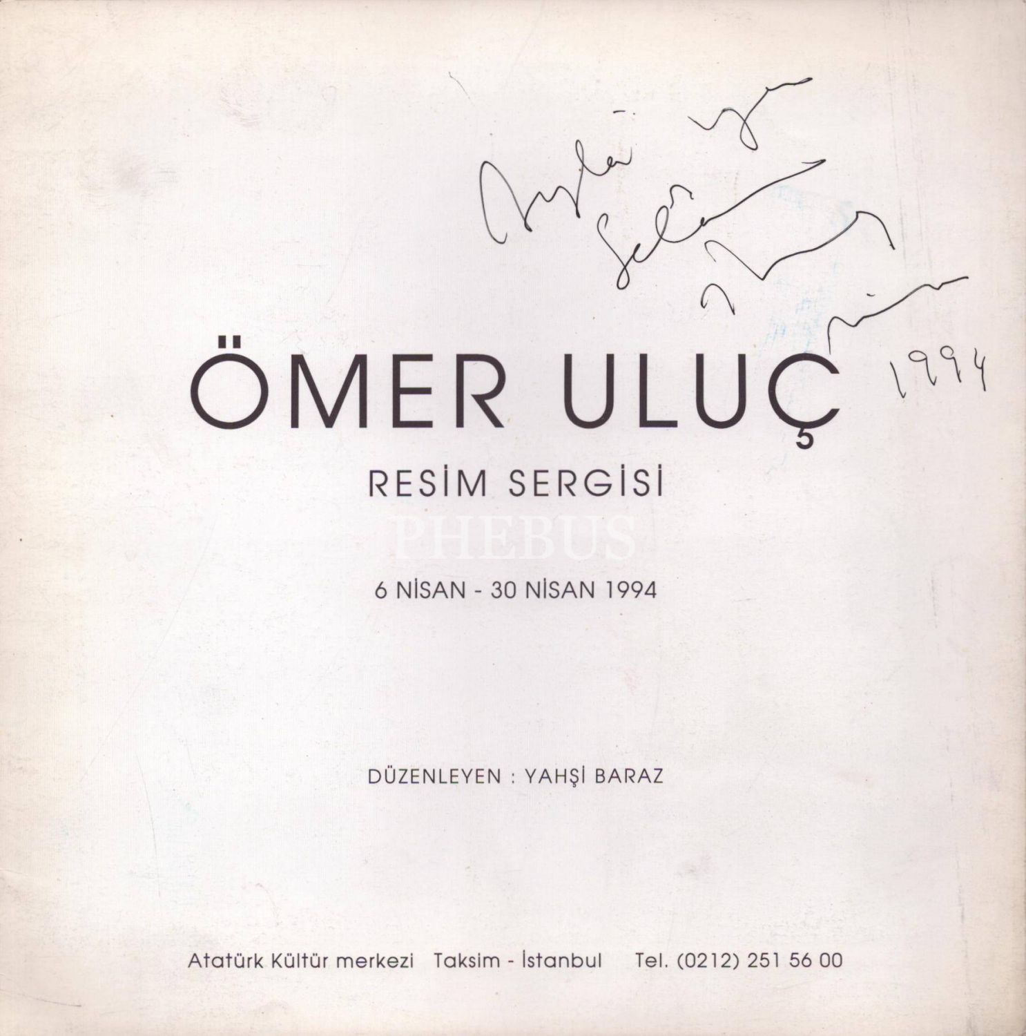 Ömer Uluç tarafından imzalı resim sergisi kataloğu, düzenleyen: Yahşi Baraz, Atatürk Kültür Merkezi, Nisan 1994, 23x28 cm