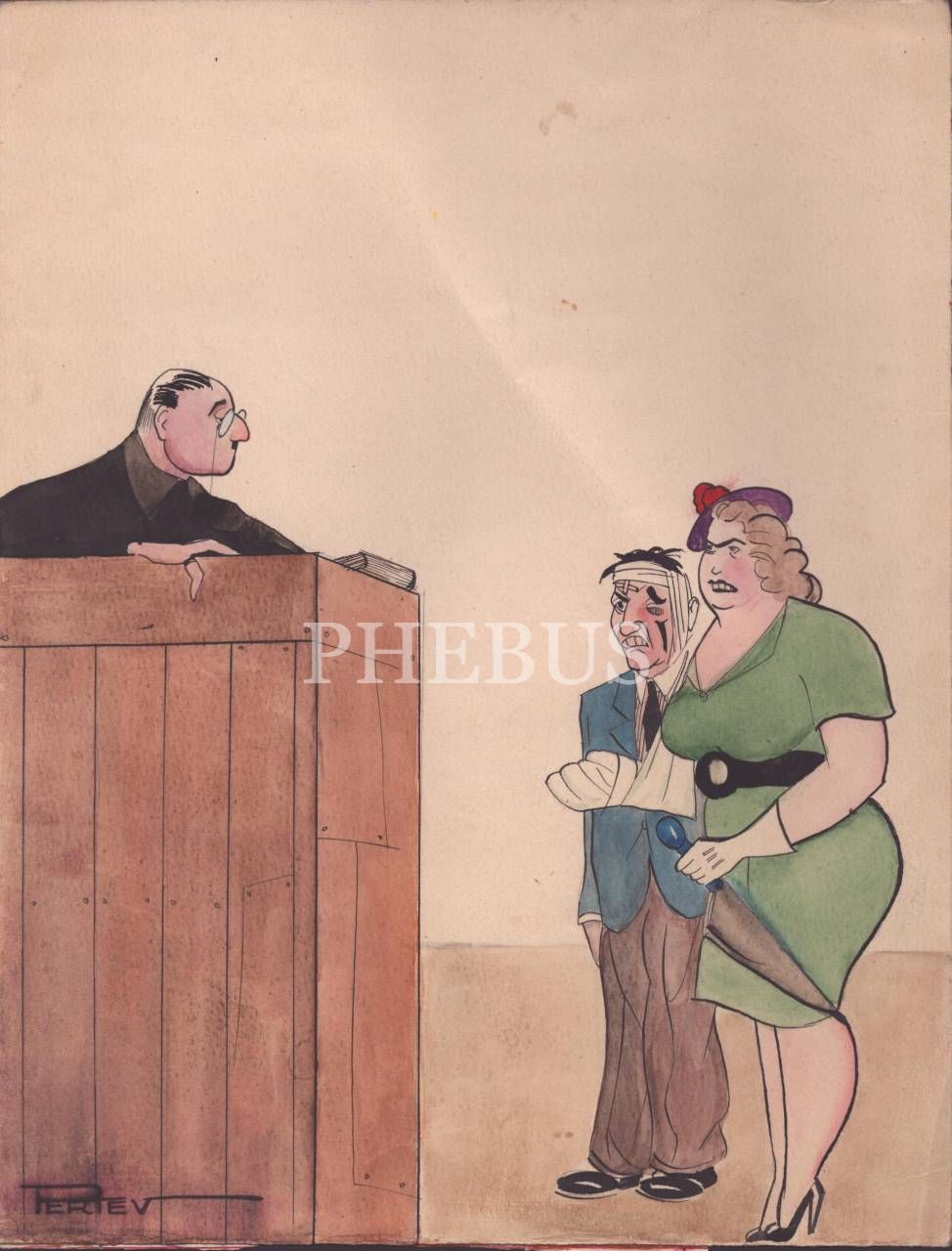 Pertev [Ertün] imzalı, duruşma salonu konulu renkli karikatür, 25x32 cm