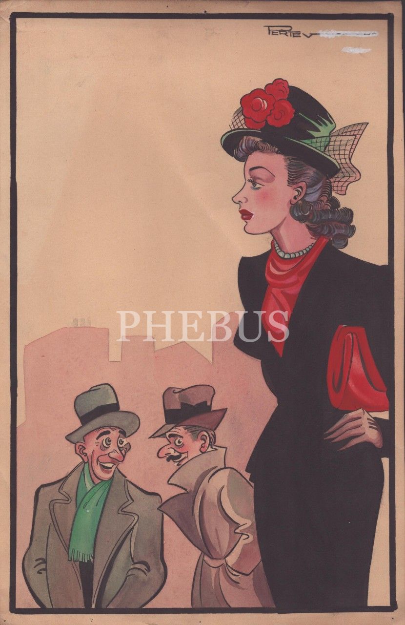 Pertev [Ertün] imzalı, kadın konulu renkli karikatür, 27x40 cm
