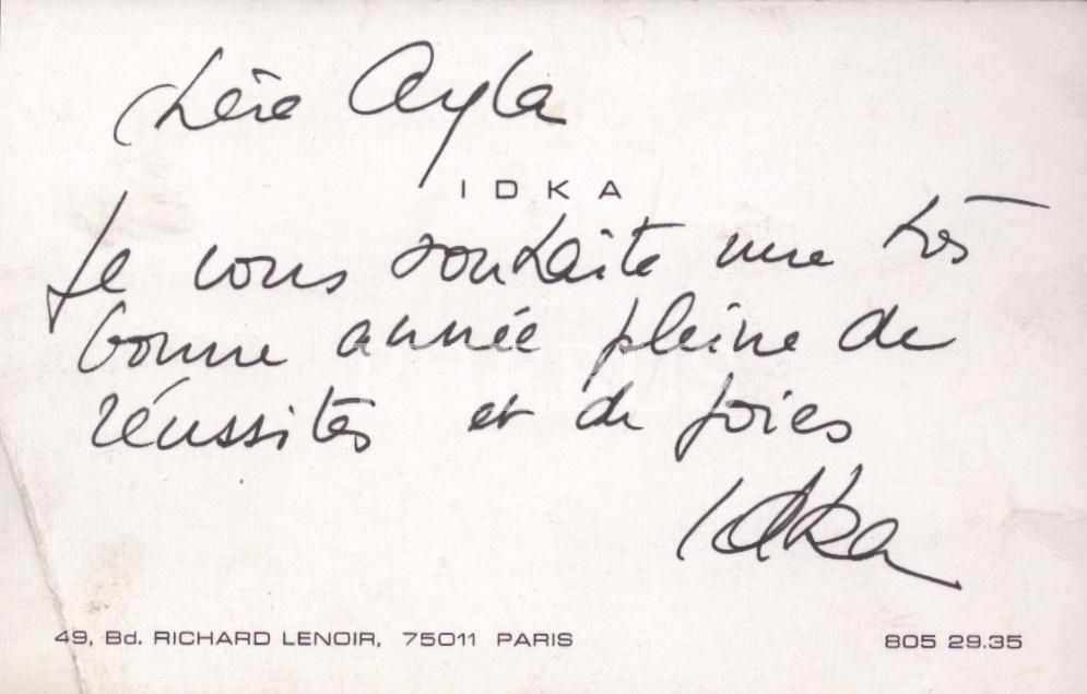İDKA´ya ait, Ayla Hüngen Seli´ye Fransızca ithaflı ve imzalı kartvizit, 8x13 cm